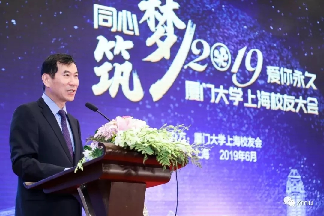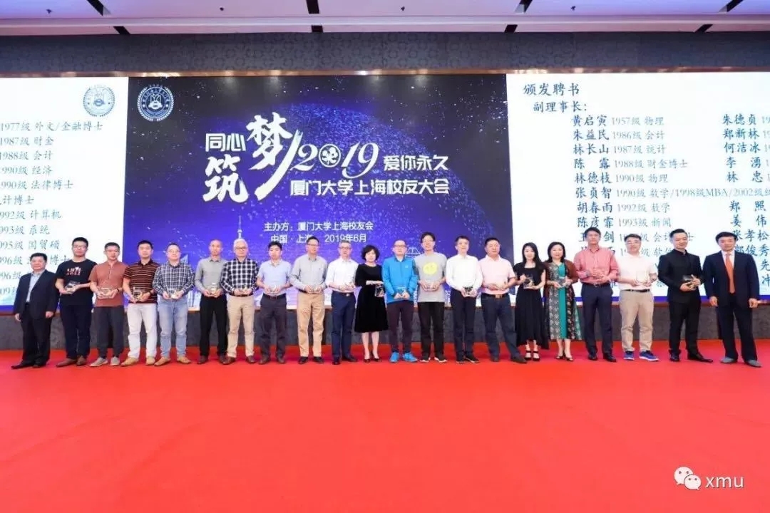 6月2日,以“同心筑梦,爱你永久”为主题的2019年度厦门大学上海校友大会在上海龙之梦大酒店盛大举行。15个分会,近400名校友(含70多位老年校友)齐聚一堂,隆重见证第九届理事会的成立。厦门大学原校长、校友总会理事长朱崇实,我校1988级政治系校友、厦门市湖里区委书记林建,厦门大学校友总会秘书长曾国斌及各地兄弟校友会代表、在沪兄弟高校校友会代表出席本次大会。