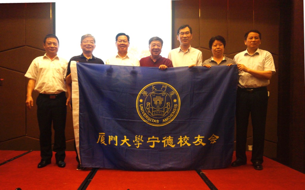 讲座结束后举行了授旗仪式。朱崇实、曾国斌共同为厦门大学宁德校友会颁授会旗。