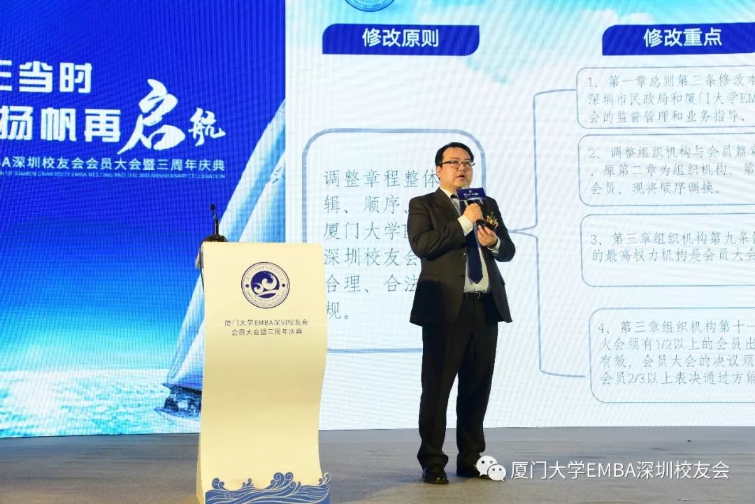 厦门大学EMBA深圳校友会会员大会圆满举办。厦门大学EMBA联合会会长金胜作为监票人为大会致辞。