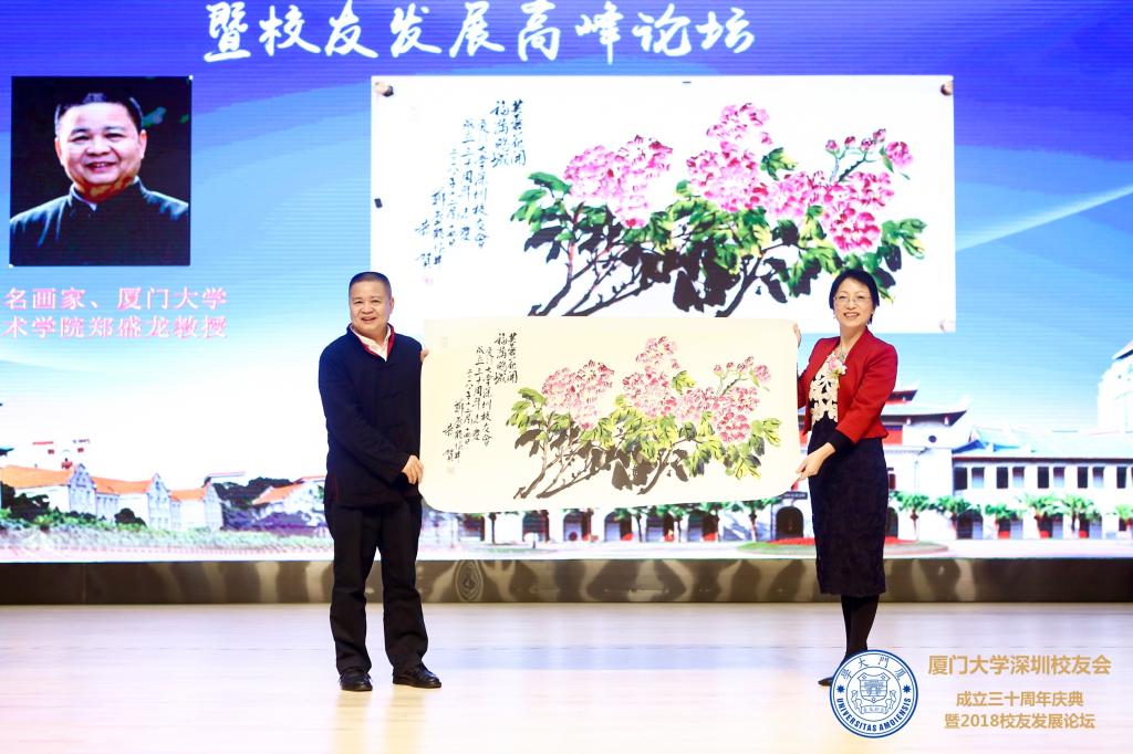 随后,大会举行了“资深理事代表”与“校友之星”的颁奖仪式,以及优秀校友分会与优秀校友社团的表彰仪式。艺术学院郑盛龙教授向深圳校友会赠送画作,旅港校友会向深圳校友会赠送礼品。