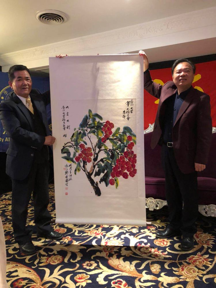 张书记还代表母校给加拿大校友会赠送了一份珍贵的礼物:一幅由母校艺术学院教授、国画大师郑盛龙所作的《大吉大利》画作。郑教授擅长画荔枝等果树,在这个充满丰收气息的华美画面中,灰黑色的枝干托起火红的荔枝与鲜绿的枝叶,“大吉大利”的黑色字体十分显眼,灼热的祝福跃然于笔墨之间,整幅作品生动、亮丽、灿烂。来自母校艺术家的温暖情怀藉由他的艺术作品,传递了母校及校友总会对加拿大校友会的关心,传递了母校对海外校友的深挚关爱。现场掌声如雷,大家感受到了来自母校的阳光和美好祝愿,自从青春相遇,从此两不相忘!校友们也转达了对母校的恒久祝福。