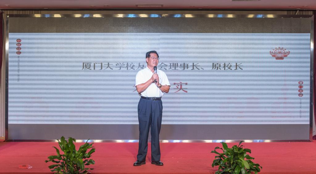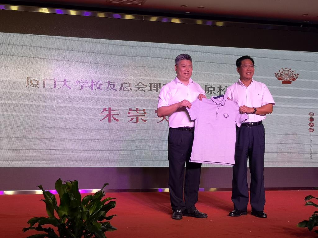 年会在一位特殊嘉宾的登场中,推向高潮。厦门大学校友总会理事长、原校长朱崇实,在校友们的热盼中上场发言。他高度赞扬了不同时期的在鄂校友们,在湖北建设发展中所做出的的重要贡献,强调了融入血脉中的“自强不息、止于至善”的校训精神,生生不息、传承有序,并激励新校友见贤思齐,今天我以母校为荣,明天母校以我为傲。同时,他也通报了母校争创世界一流大学的各项举措,期待校友们努力工作,回报社会,回报母校。随后,武汉校友会理事长李斌向老校长朱崇实赠送了武汉校友会特制纪念衫。