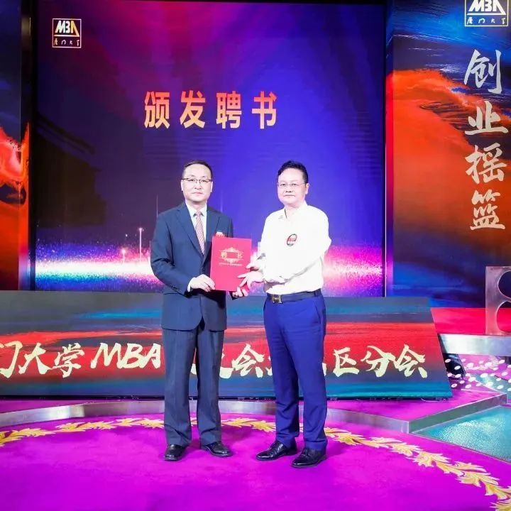 紧接着,屈文洲宣读厦门大学MBA校友会大湾区分会第一届理事会主要成员名单。张权勋担任会长,杨光裕担任名誉会长,白晓东、黄龙耀、颜全铨、郑伟担任执行会长,郑伟担任秘书长,霍佳祺、刘羽夕、宋正坤、曾学华担任副秘书长。在现场嘉宾的见证下,屈文洲为新一届理事会主要成员颁发了聘书,并向会长张权勋授予厦门大学MBA校友会大湾区分会会旗,至此,厦门大学MBA校友会大湾区分会正式成立。