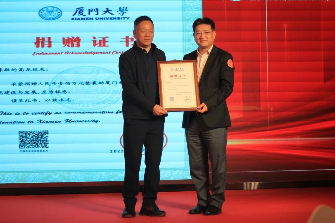 作为特别环节,大会举办厦门大学1980级化学系校友、厦门大学云南校友会会长、云南祥华教育集团董事长高龙捐赠母校签约仪式。在累计捐赠母校900万元基础上,高龙再次慷慨捐赠100万元,襄助厦门大学化学化工学院建设与发展。曾国斌与高龙上台签订捐赠协议,江云宝、宋毅、张伟、王增荣、章鹰龙、姚明、林风云、赵浣淳等共同见证签约。江云宝代表母校向高龙颁授捐赠证书,并高度赞扬他感念母校栽培、心系母校发展的大爱善举。