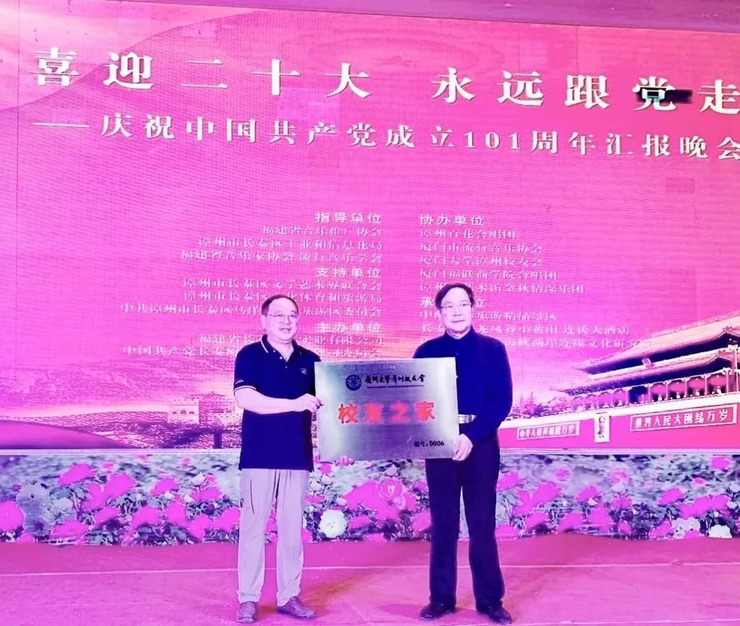 晚上,校友们应邀观看了长泰厦广实业有限公司党委主办的庆祝七•一建党节文艺汇演。晚会上,陈志伟代表校友会授予长泰厦广实业有限公司“厦大漳州校友之家”称号,该公司董事长连文成校友上台接受了牌匾。
