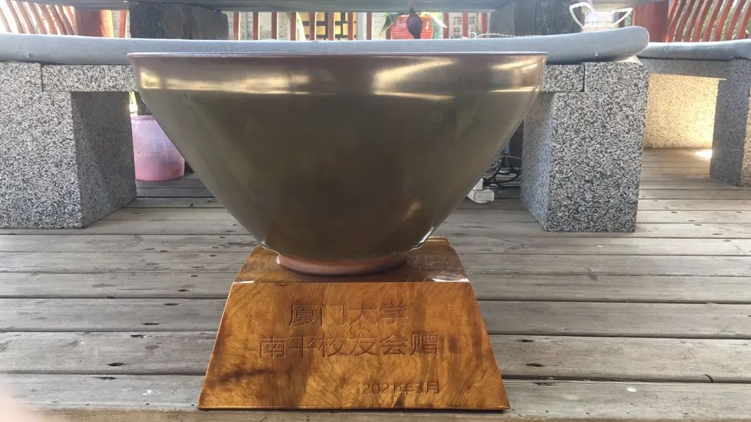 一个“超级建盏”盛满美好祝福。建盏是国家级非物质文化遗产,是中国黑瓷文化的代表作,南平市建阳区是历史上建窑建盏的发源地,建盏兴盛于两宋,是皇家御用茶器。用一个独具特色的建盏向母校献礼,成了众多校友的意愿。在知名建盏专家、南平校友会副秘书长谢道华的精心策划下,经过精心比选制作人,精心设计盏器的尺寸、色彩、落款等细节,南平校友会特委托福建省建窑建盏烧制技艺代表性传承人詹桂溪来完成这项任务。