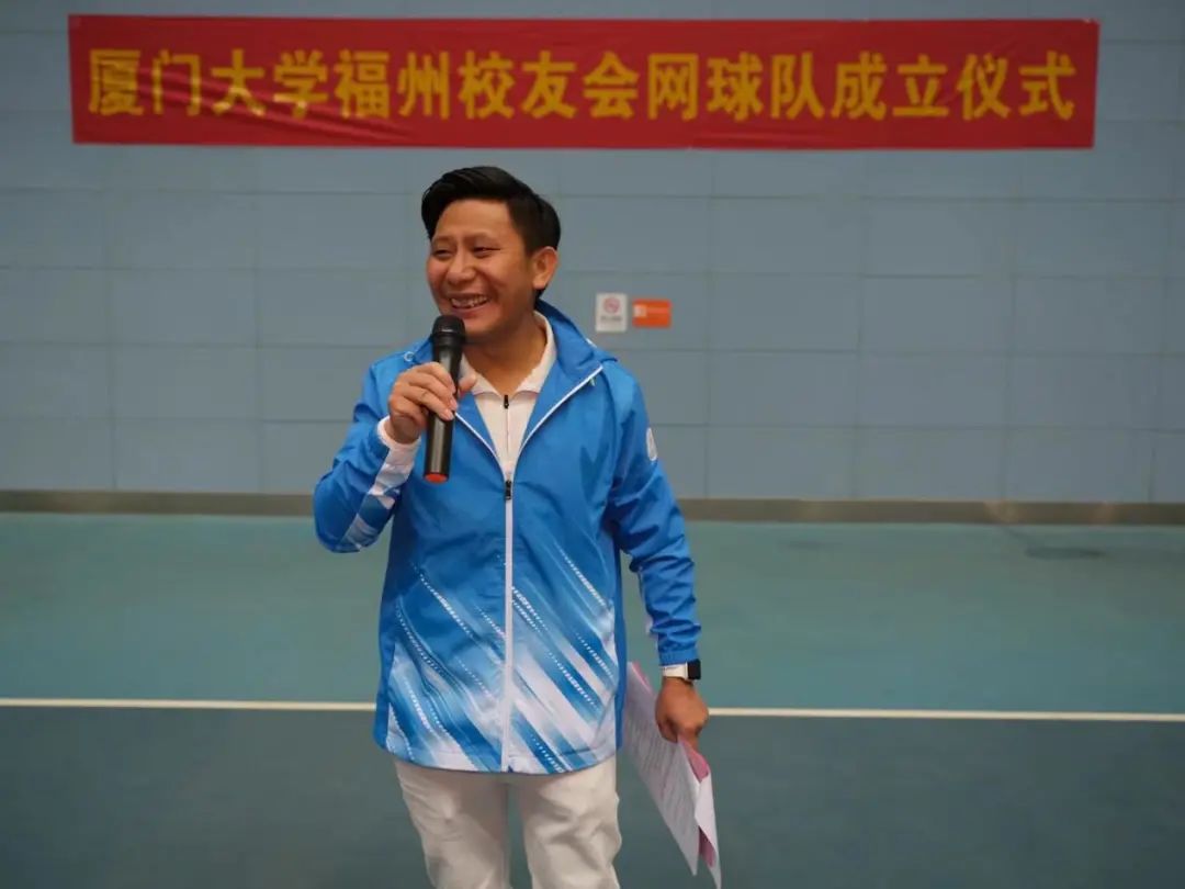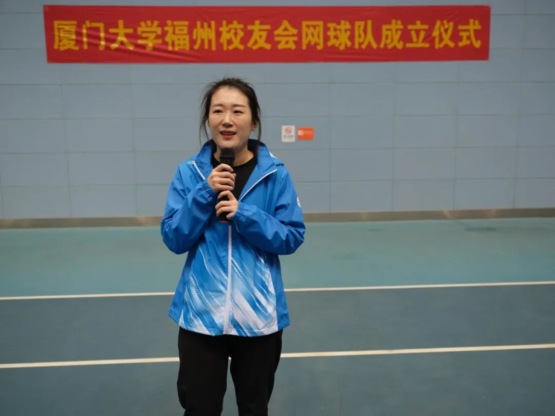接着,福州校友会网球队林清代表网球队新生发言,她讲述了自己在厦大时候因选修网球体育课而与网球结缘,在接触网球的过程中感受到网球是一项激情与优雅兼备的运动,在网球活动中不仅锻炼了体力,还提高了自我的身体协调性与节奏感。同时,新生代表林清还表示,网球队的成立,为喜欢网球的厦大人提供了链接的纽带和桥梁,让他们这些菜鸟新手也能也能找到一群水平相当的伙伴一起成长,也相信在网球队浓厚的氛围和专业教练的指导下,菜鸟们也将不断晋级,将网球运动的魅力在校友中不断传递。