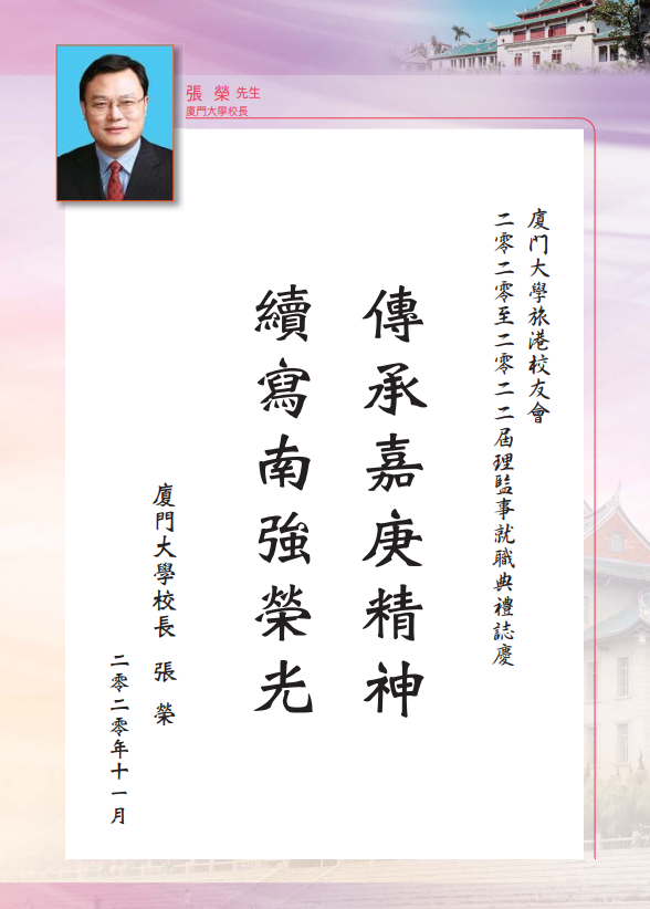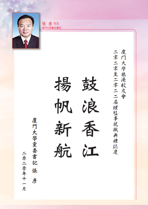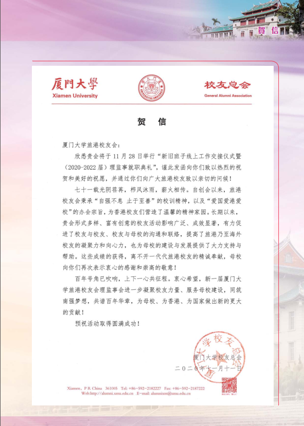 黄隆基还表示,原定11月28日的理监事就职礼得到了香港社会和学校领导的关心支持:中联办副主任陈冬,特区政府行政会议召集人陈智思,厦门大学党委书记张彦、校长张荣,香港公开大学校长黄玉山等题辞勉励,还有全国政协常委、香港福建社团联会荣誉主席吴良好先生,中联办教科部蒋建湘部长,华闽集团丁炳华总经理等答应为活动主礼。这是对旅港厦大校友最大的支持和勉励,也充分说明,在香港这场疫情下,内地从中央到各省市和各部门,始终关注爱护香港,关心和支持香港的同胞,令在新冠疫情困扰下的香港同胞感受到中央政府和各有关方面的友善与温暖。衷心感谢所有这次关心、支持厦大旅港校友会的各级领导和社会各界人士。