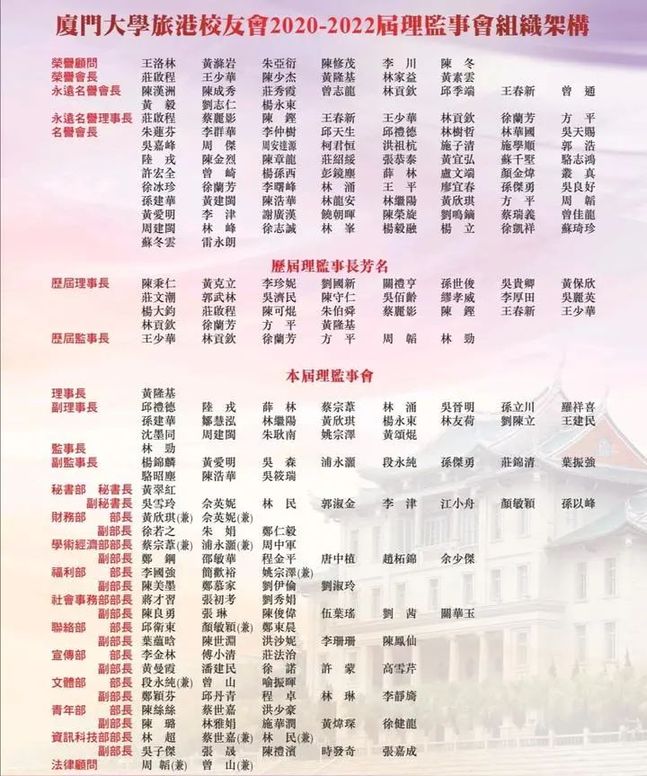 厦门大学旅港校友会2020-2022届理监事会组织架构