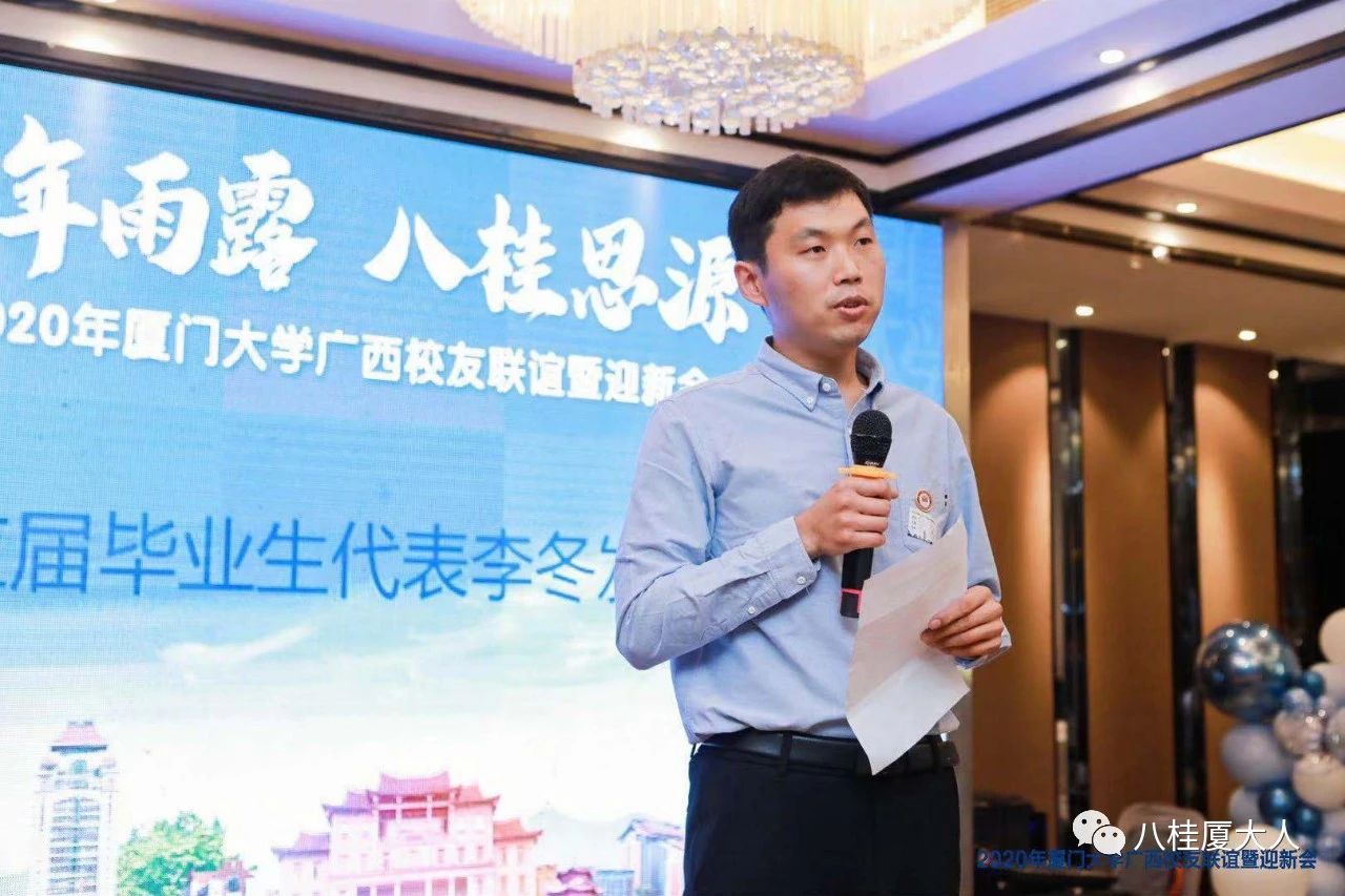校友交流环节,桂林分会会长肖笛波、北海分会会长范航清等校友代表分别上台致辞。李冬代表新毕业校友发言,表示将以师兄师姐为榜样,以更高标准严格要求自己,一同努力投身于八桂大地建设。