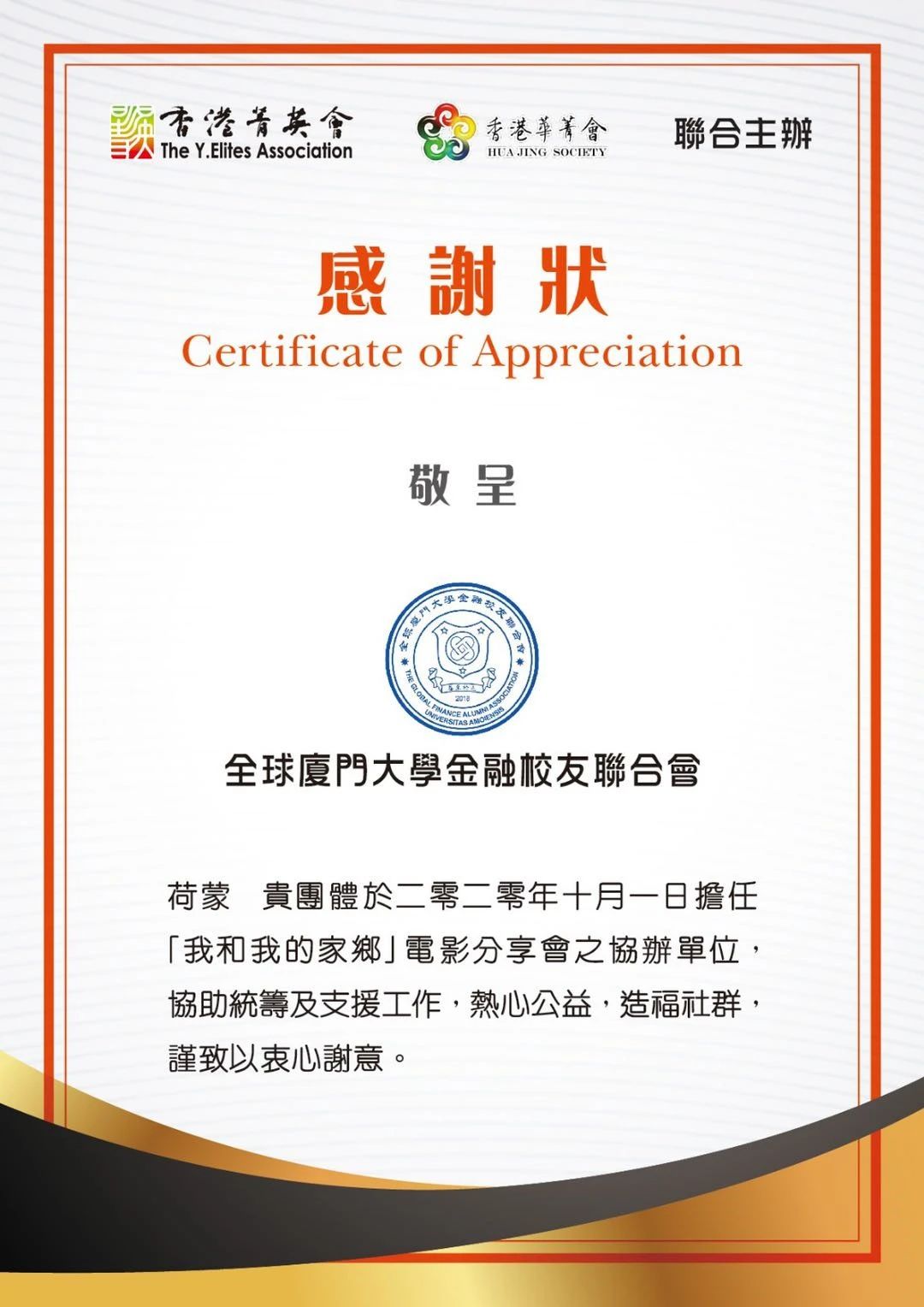 香港菁英会曾凤珠主席、香港华菁会陈爽主席向全球厦门大学金融校友联合会陈少杰会长颁发感谢状。