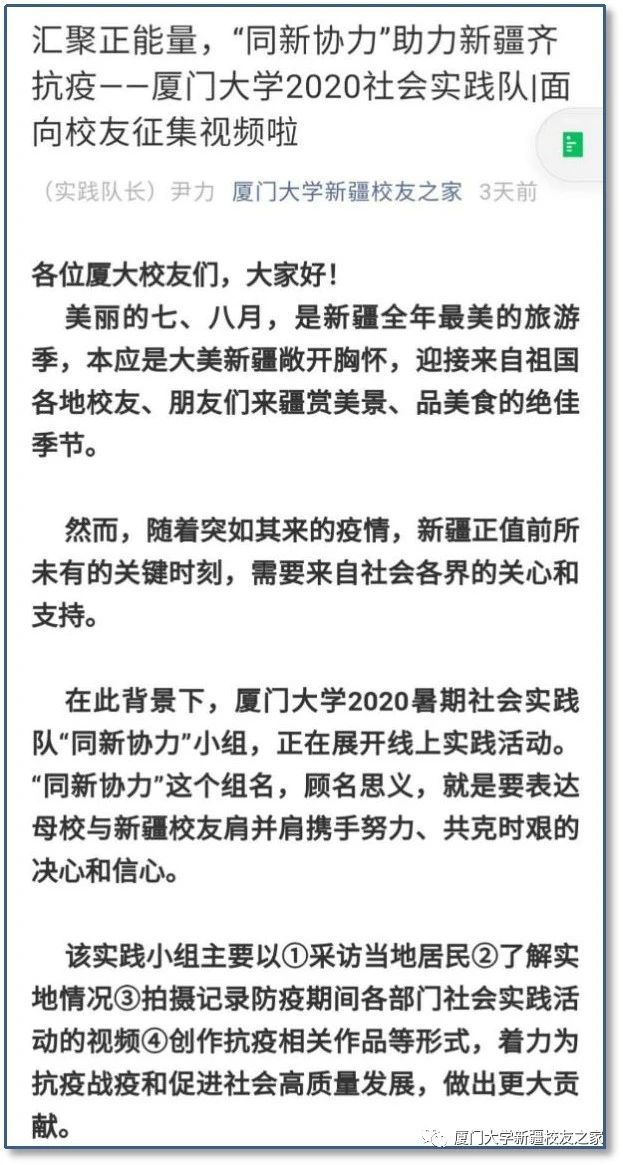 2020年8月8日,厦门大学新疆校友会与“同新协力”暑期实践队通过“厦门大学新疆校友之家”公众号,向广大校友发起了征集助力新疆抗疫正能量、加油视频素材的倡议活动。