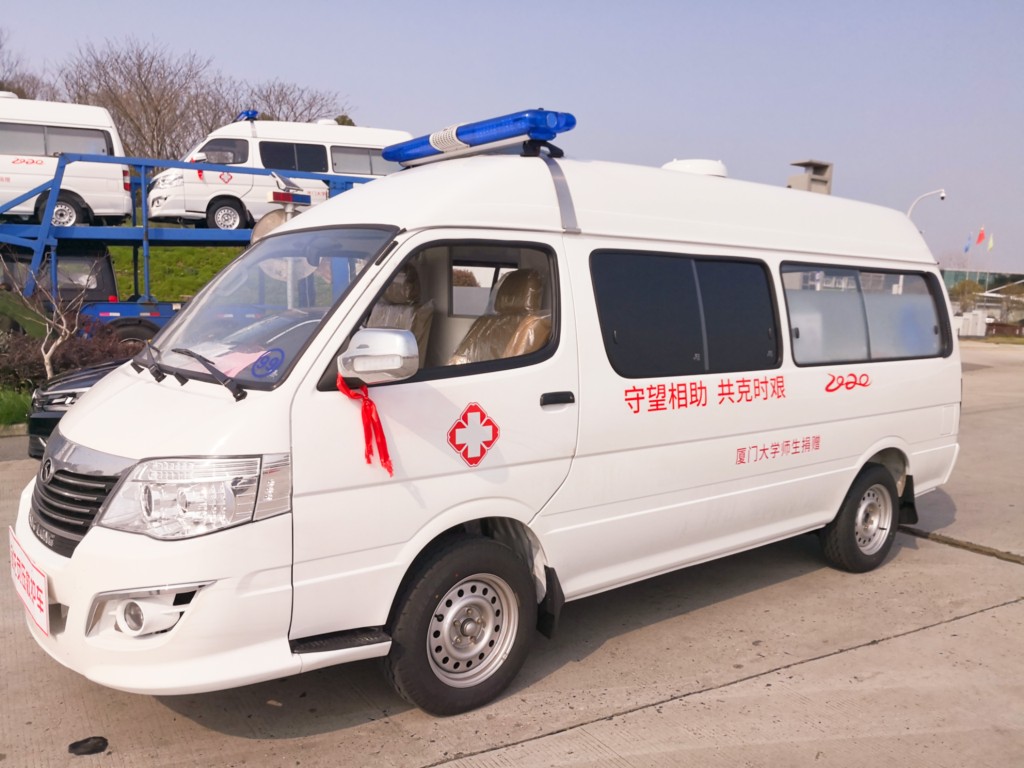不一会,一辆专门拖运汽车的巨型卡车缓缓从高速公路路口出来,蓝色的托架上,四辆白色的救护车一字排开,煞是好看。车子停稳后,可以看到车厢上印着红色的两排字,上一排写着:“守望相助 共克时艰 2020”,下一排用小一号字写着:“厦门大学师生捐赠”。