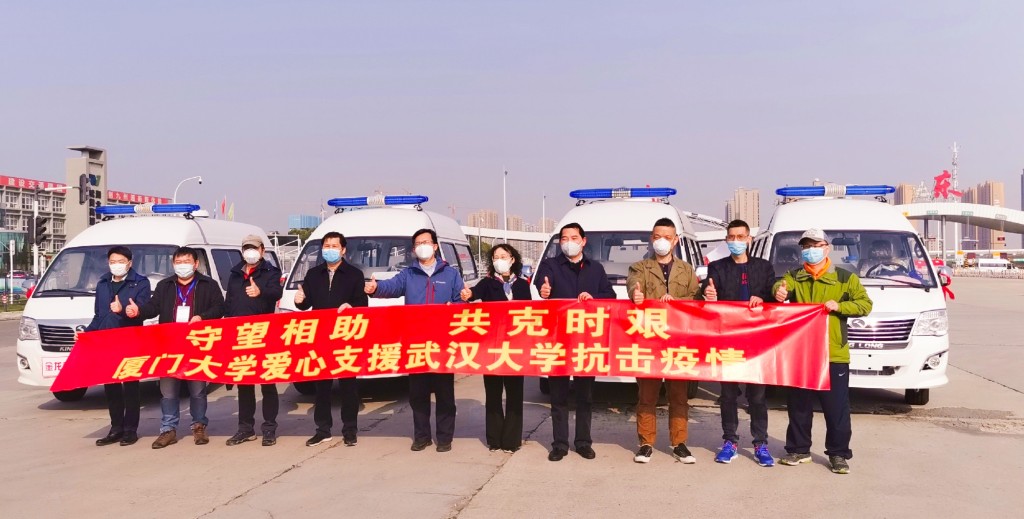 四位厦大校友代表也抓紧时间在救护车前合影留念,带着某种说不出的自豪感,也带着似乎要奔赴战场前的那种决心与急切。马上,这四辆救护车,就要去到各自的医院,并投入到救治病人的战斗中去了!