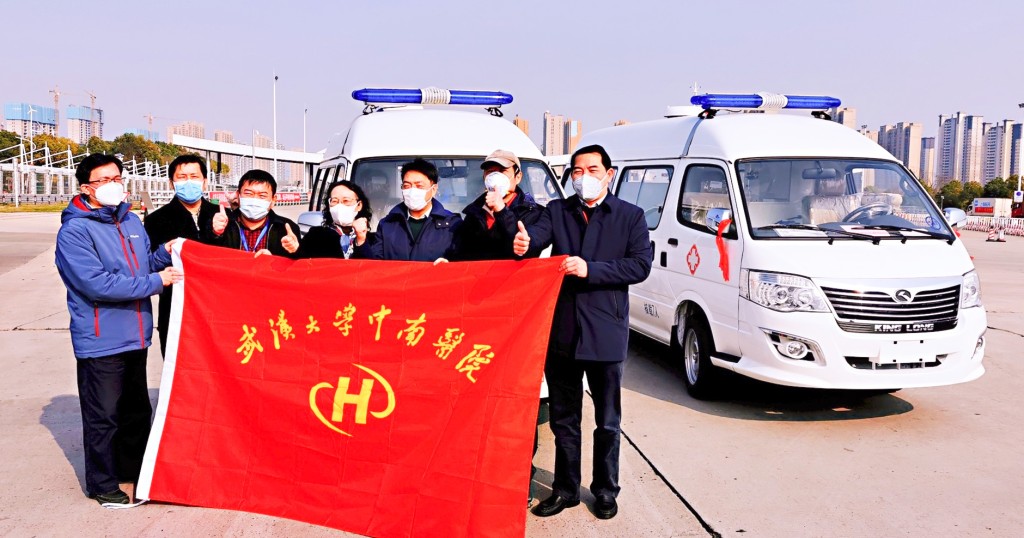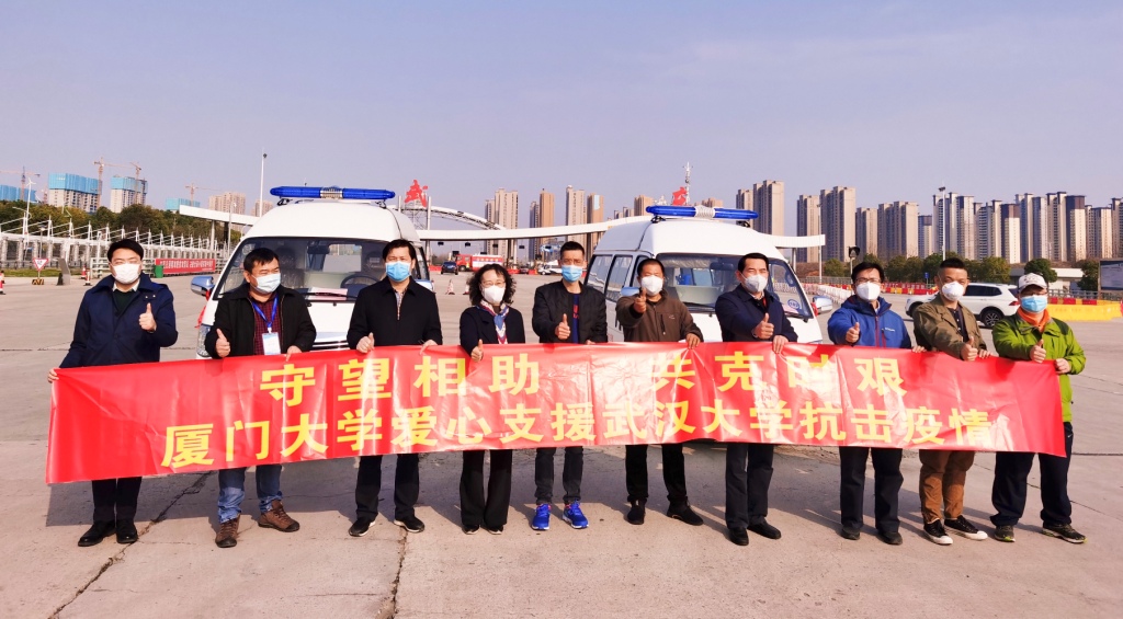代表厦门大学参加捐赠仪式的另外三位武汉地区的校友分别是湖北省人大常委会委员、省工商联副主席、1982级财金系校友彭斌;湖北省财政厅预算处处长、1986级财金系校友赵红兵;九州通医药集团股份有限公司总经理、武汉校友会副会长、EMBA2011级校友龚翼华。前不久,厦门大学武汉校友会为配合母校援助湖北籍学生抗疫,专门成立了预备应急小组,碰巧的是,今天到场的四位校友,都是应急小组成员。救护车卸下来后,龚翼华校友专业精深,马上脱口而出:“负压救护车,具备隔离功能”。