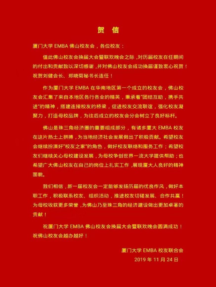 金胜带来了EMBA校友联合会的贺信,贺信充分肯定了佛山校友会的建设成绩,也对佛山校友会的未来充满嘱托和殷切的期待。