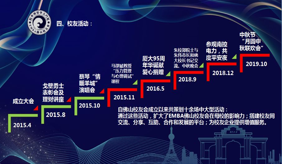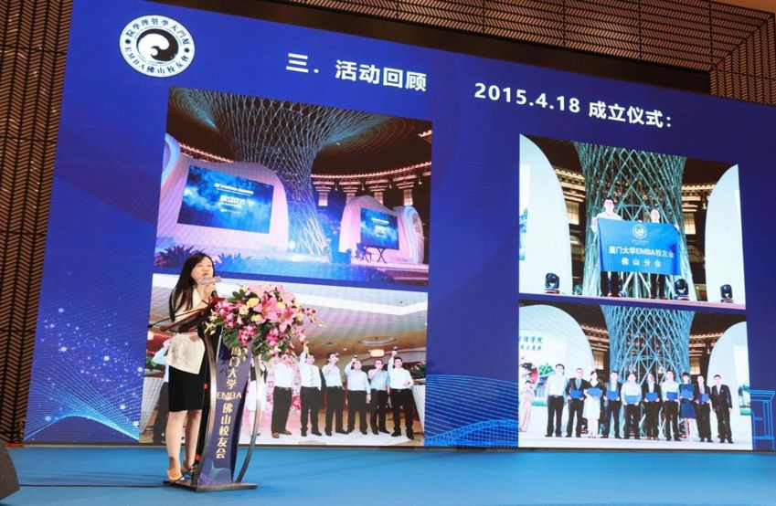 厦门大学EMBA佛山校友会于2015年4月18日成立,是广东地区第一个成立的厦大EMBA校友会,具有里程碑的意义,同时体现了佛山学子心系母校、敢为人先、勇于挑战的团队精神。四年来,佛山校友会策划了许多经典校友活动:戈壁勇士表彰会、蔡琴“情暖羊城”演唱会、厦大95周年华诞献爱心捐赠、中秋晚会、平安夜晚会等。通过这些活动,扩大了EMBA佛山校友会的影响力,为校友之间搭建了一个交流、分享、互助、合作、发展的平台。