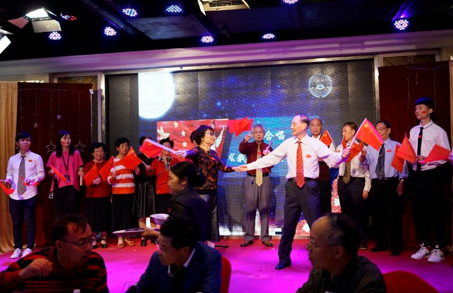 随后,校友们又献上一首即兴歌曲《我的中国心》,在领唱老校友浑厚的嗓音中,歌曲饱含着对祖国母亲的深情。全场校友被这样的气氛牵引着,新老校友们共同挥舞国旗的画面触动在场每个人的心弦。