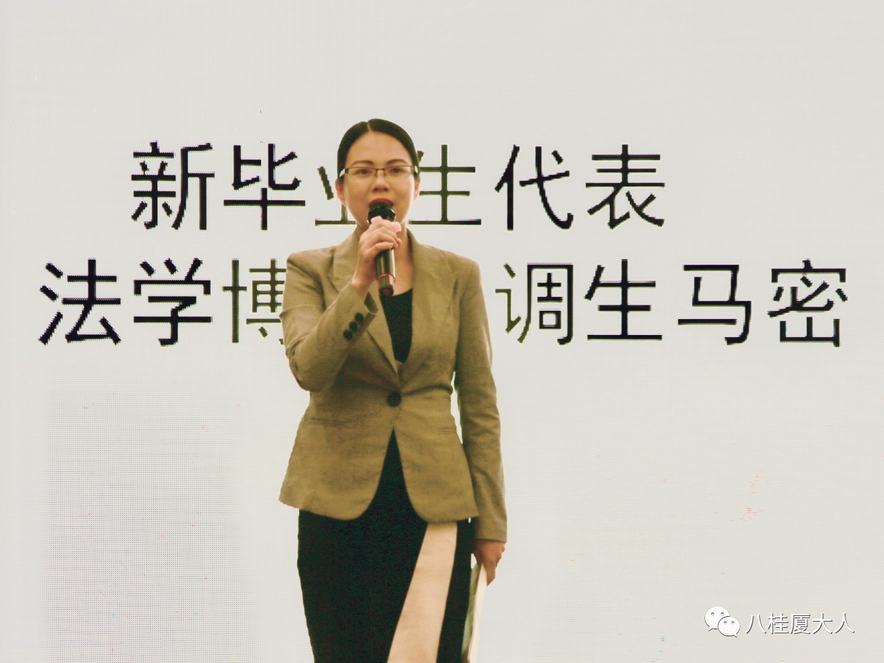 2019届法学博士毕业生马密代表新校友发言,她表示,广西校友会既是厦大学子交流的起点,也是毕业生们最温暖的港湾,在未来将会与校友们一道将广西建成“南国之强”,不辱厦大人的光荣与使命。