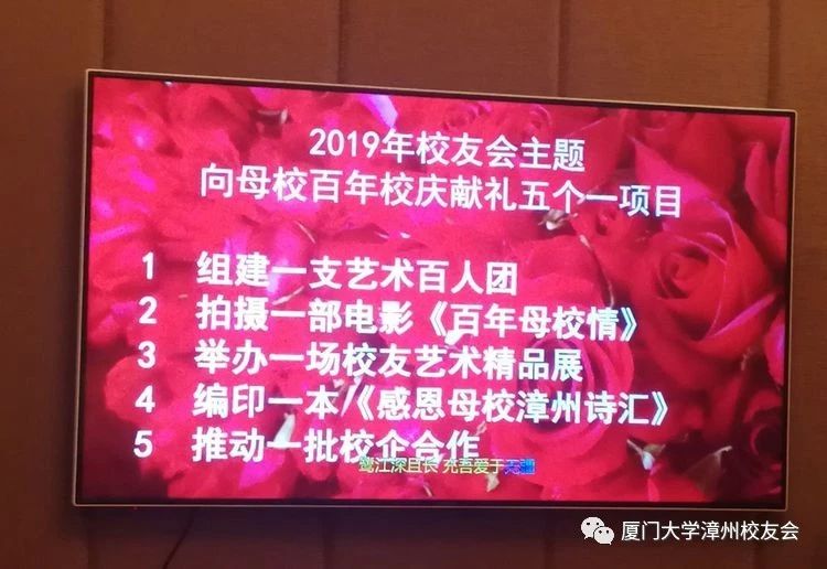 “2019年厦门大学漳州校友会,将围绕‘五个一’项目,启动并实际推进向母校百年校庆献礼工程,此为本会新的一年乃至2020年的工作主题”,这是漳州校友会执行会长兼秘书长吴两同在日前召开的漳州校友会2018年年会上所部署的明、后两年工作目标。