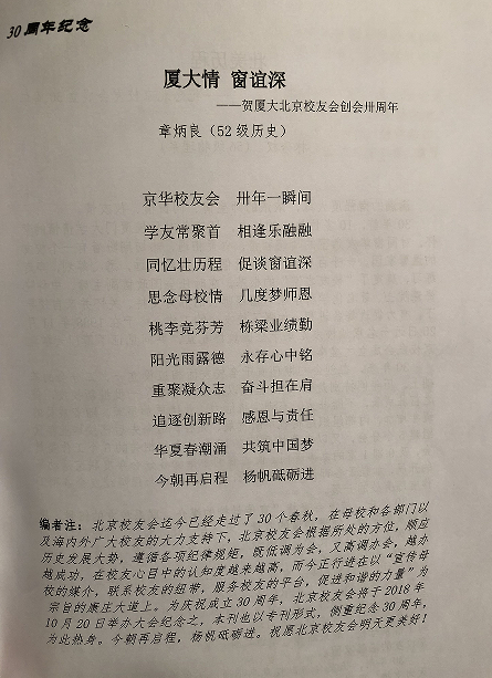 今年是厦门大学北京校友会成立三十周年,三十年来,各届校友为校友会的发展付出了很多努力,为在京厦大人打造了一个温暖的家,今年的重阳联谊会也显得格外有意义,老中青校友齐聚一堂共话南强情。
