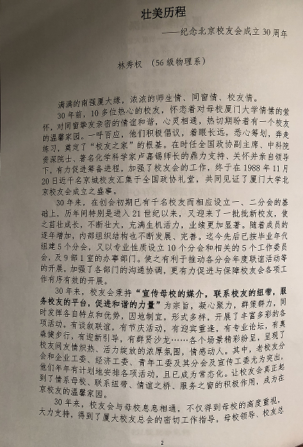 在场有许多老一辈厦大人,心怀嘉庚精神,在年轻时候在自己的岗位上为祖国做贡献,在退休后依然活跃在校友会的工作群体中,比如56届厦大数学系、中科院院士林群;比如老校友分会的编辑——历史系52级章炳良、物理系56级林秀权、外文系61级张锦辉,在28期的《校友通讯》用笔记述了校友会的历史。