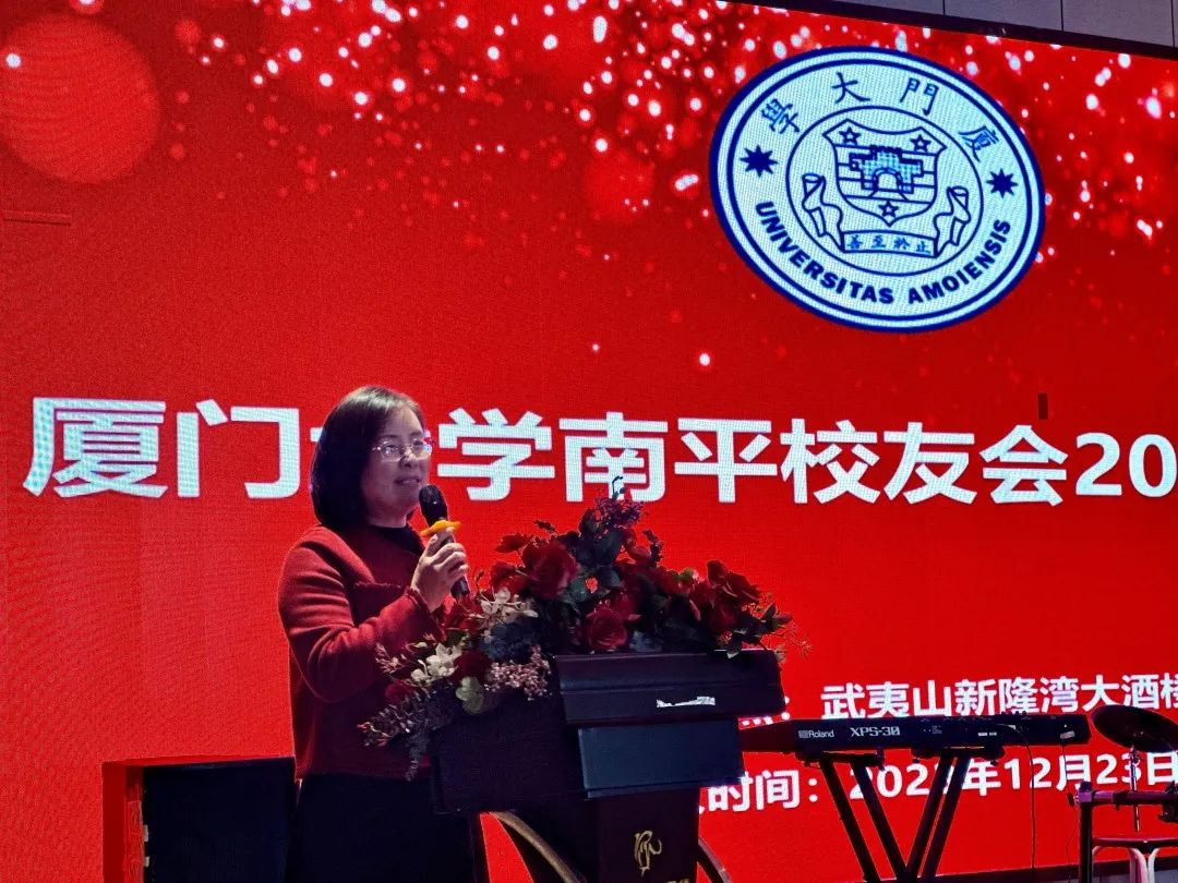 之后,厦门大学南平校友会会长邹琍琼代表校友会向大会作2023年度工作报告。她指出,南平校友会自成立以来,广泛联系闽北校友,每年组织开展联谊活动,增进感情,凝聚力量。她讲到,建阳、松溪、武夷山、邵武等地校友之家陆续揭牌,正是“厦大情怀”与“厦大精神”将大家联结在一起。报告过程中,她对毛景华、周红、龚永富、武夷山职业学院等个人及单位的慷慨捐赠和无私奉献表示衷心感谢,感谢各界校友为南平校友会的蓬勃发展添砖加瓦。在报告中,她回顾了南平校友会近年来成功举办的校友聚会、校友企业走访及南平“人才校园行”等活动,并简述了校友会来年的工作计划。