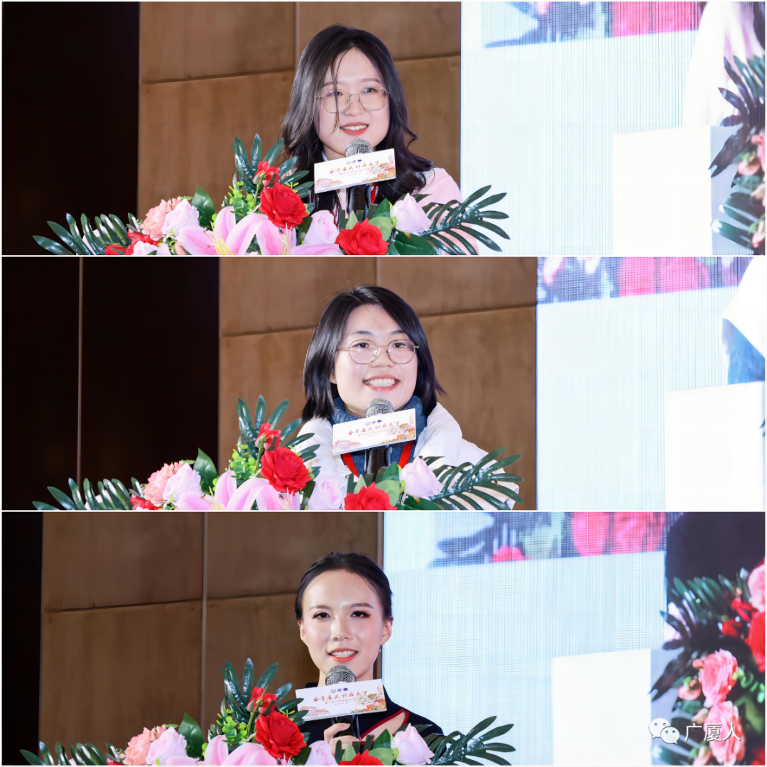 2022届校友孟璇君、黄悦昕,2023届校友罗艺博作为新毕业生代表上台发言,分别介绍了自己毕业后的工作和学习情况,表示很高兴毕业来到广东后加入校友会大家庭,认识了很多新朋友和师兄师姐,再次感受到母校、母系的温暖,并期待未来也贡献自己的一份力量。