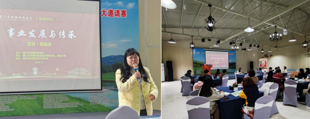 活动的开场就从“愚公”的故事开始,蒋佩琪女士在第11期榕城讲堂上为大家做“事业发展与传承”主题演讲。这位“愚公”就是在台湾省有三家上市公司,企业遍布宝岛,同时心系祖国家乡建设,出钱出力、大爱慈行的著名台湾企业家蒋启弼先生。蒋启弼先生出生在连江,9岁时便随父亲到宝岛台湾,后成为非常成功的企业家。1992年返乡后,他陆续在家乡投资设立五个公司,其中便包括他最爱的温泉高尔夫球场。他呕心沥血,将敖江中的桃园洲围堤三千三百多米,把一个荒芜泥泞之地如愚公移山填海般变成了青山环抱、绿水掩映的国际标准十八洞球场,并为家乡筑堤坝,解决了洪涝之患,造福乡亲。彼时的连江还只是一个交通不便的偏远小县城,直到十几年后交通才发展好。蒋启弼先生有远见地为连江设计出这样一张独特的名片,并做了非常完整的规划,可谓是乡村振兴的1.0版。蒋佩琪女士介绍到,父亲早有想法在家乡发展大健康产业。依托球场的生态优势规划养生酒店、养老社区、旅游度假区等,打造医养结合的疗养旅游胜地,是她的奋斗目标。蒋佩琪女士对父亲事业发展和传承、对振兴家乡完成父愿的那份决心和毅力,令人佩服。在场的校友纷纷在互动中向她表达了敬佩、鼓励和支持。