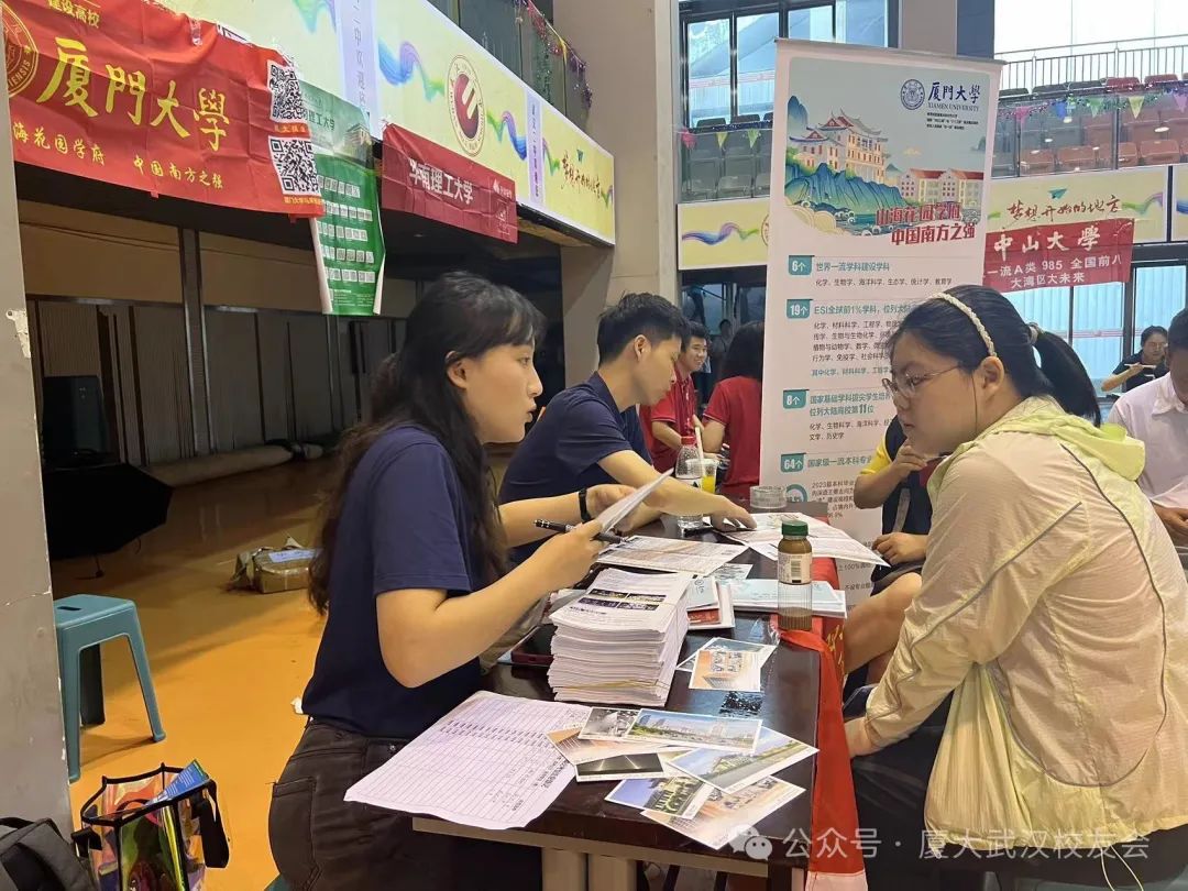 武汉最后一个咨询点位设置在武汉二中,尽管这天暴雨如注,厦门大学的展位依然吸引众多学生和家长们慕名而至。