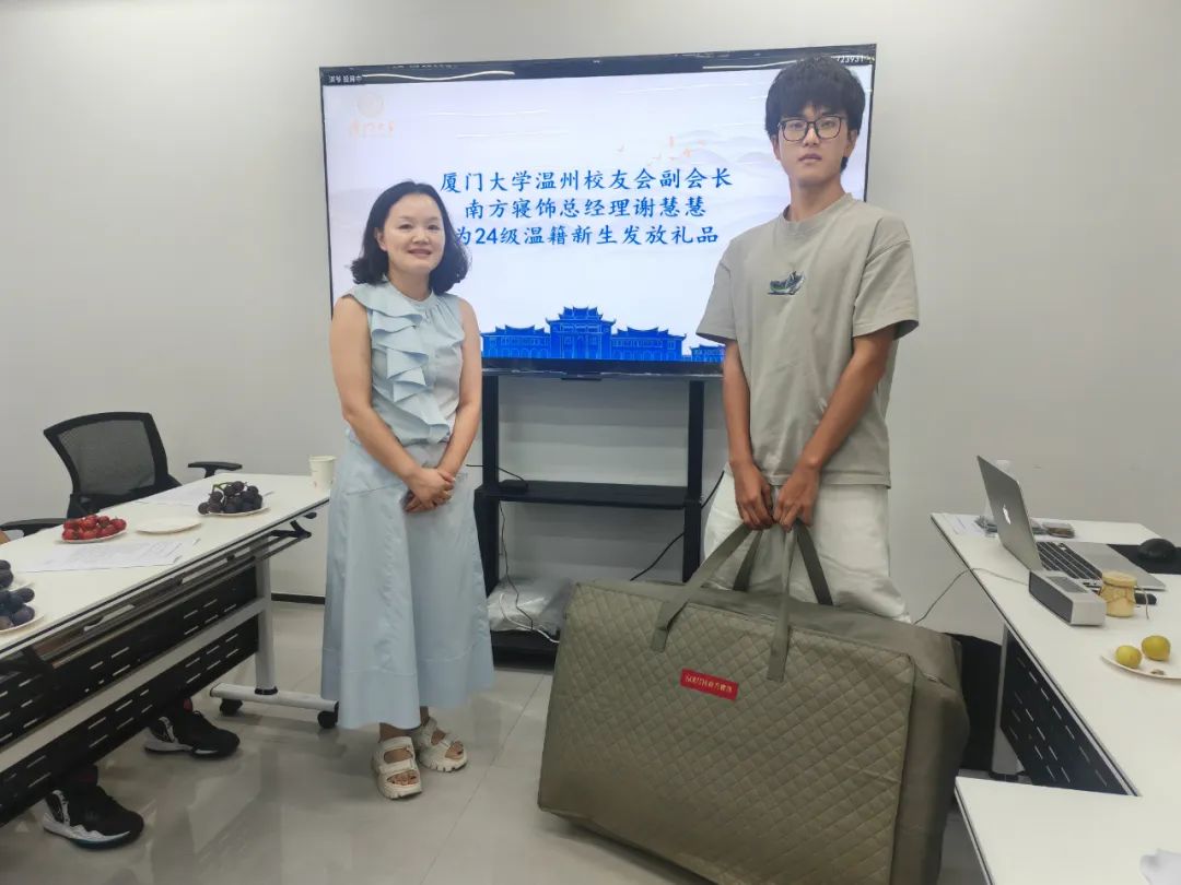 厦门大学温州校友会副会长,南方寝饰总经理谢慧慧校友为每位新生发放“南方寝饰”提供的床上用品大礼包。