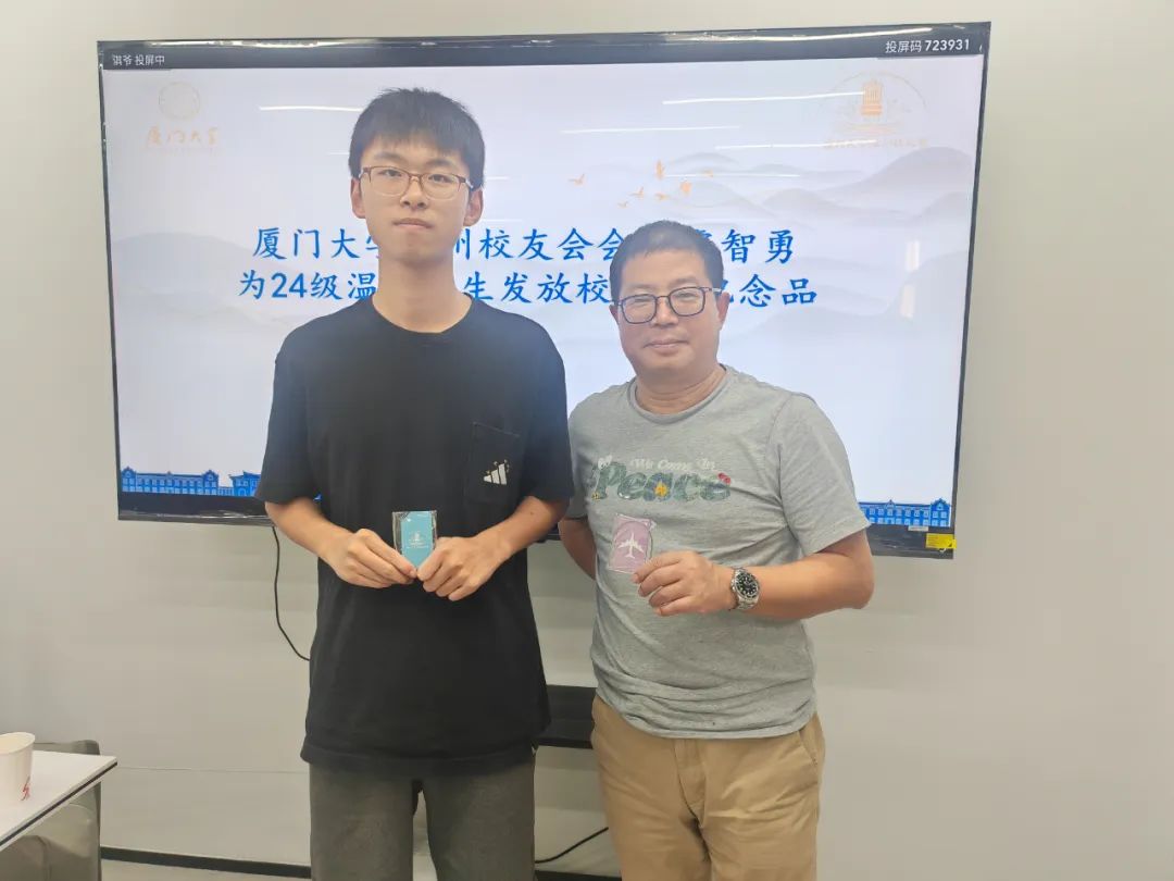 虞智勇为新生发放温州校友会提供的行李牌纪念品。