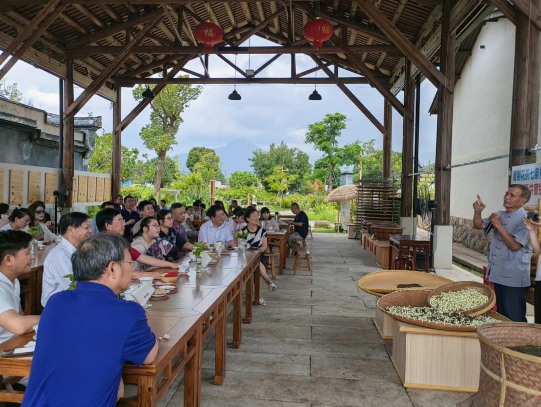 告别总部后,参访团奔赴行程第二站——春伦大众茶馆体验地。曾荣获全国茉莉花茶制作大赛一等奖的福州茉莉花茶传统制作工艺传承大师张子建向校友展示茉莉花茶制作活动中“窨制花茶七条椅、平抖堂拜烘窨提”独有意境,大家仿佛踏入一场视觉与味觉双重盛宴,深刻体验到传统茶文化魅力与创意无限可能。花茶与文化文创表演相遇,不仅为校友提供一次难得文化体验机会,更让大家在轻松愉悦氛围中加深对茶文化理解和感悟。这种融合体验,促进传统文化传承与创新,也激发对美好生活向往和追求。