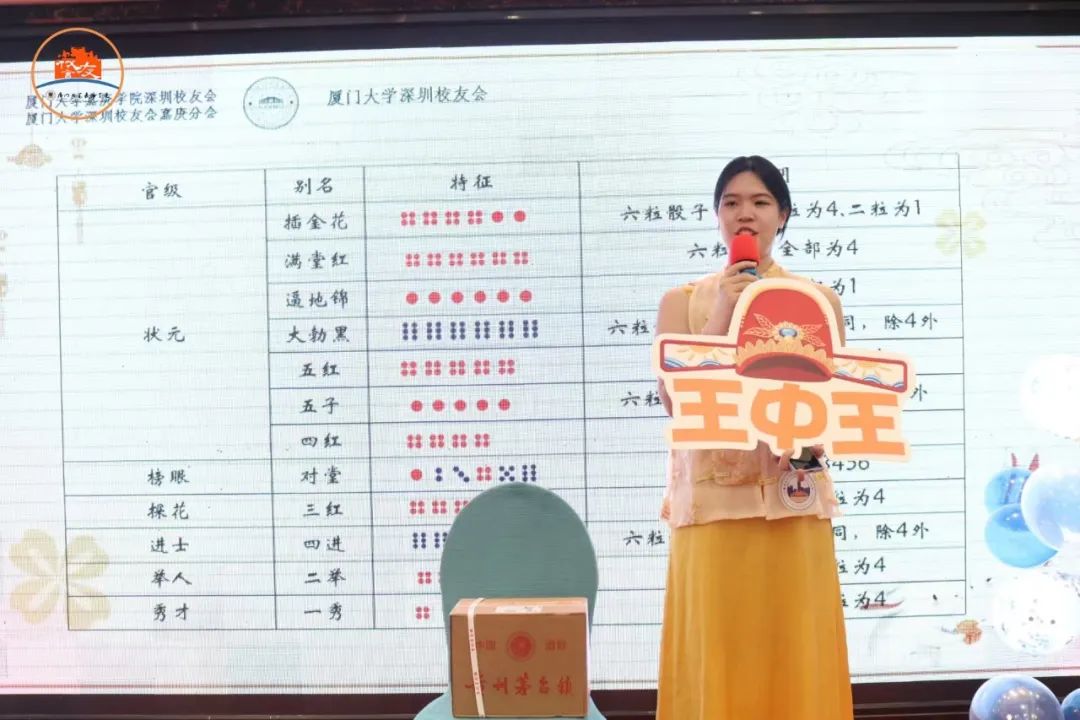 今年的博饼嘉年华更是高潮迭起,气氛紧张而兴奋。经过多轮激烈的比拼,最终2021届管理学院滕怡颖校友凭借出色的手气与运气,一举夺得“王中王”称号,赢得了现场最为丰厚的奖品,引来阵阵掌声与欢呼。滕怡颖在发表获奖感言时表示:“感谢厦门大学嘉庚学院深圳校友会,让我有机会重温校园记忆,与校友博饼共庆中秋。身为厦大嘉庚学子,自豪感是大家的骄傲,愿我今晚的喜悦和好运能传递给大家。”