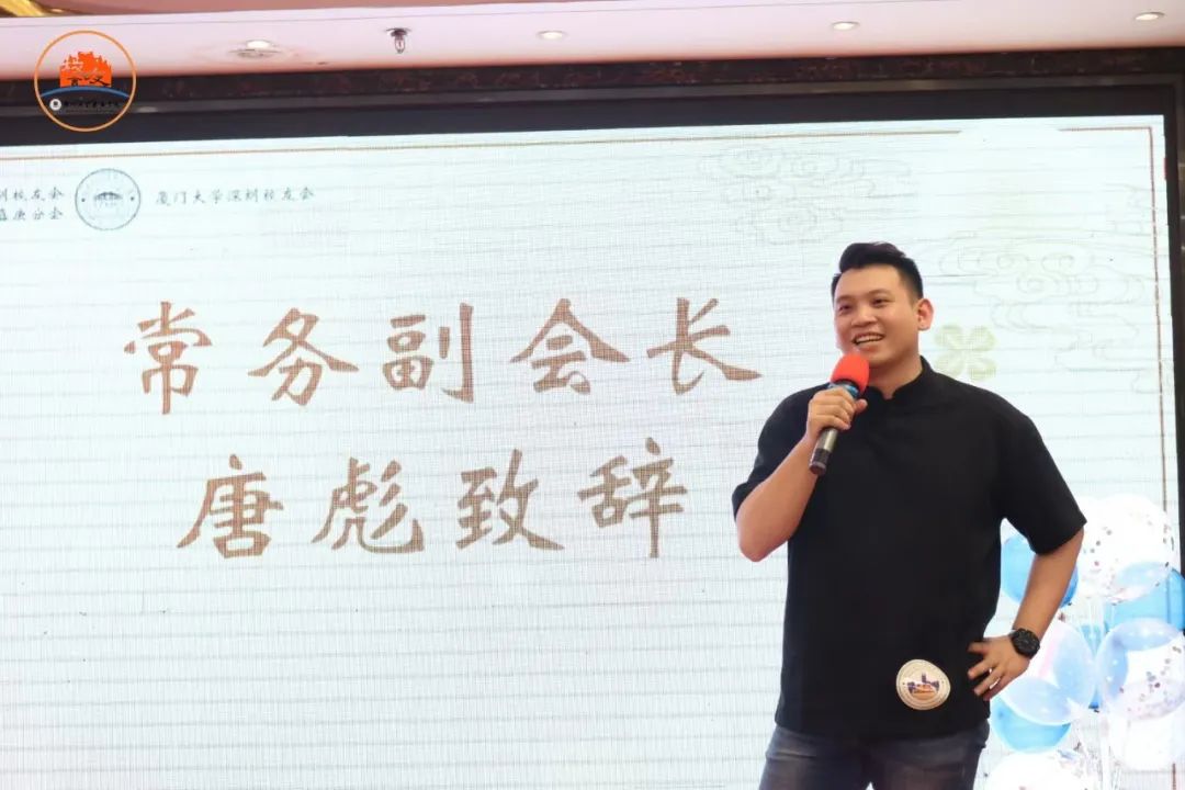 随后,厦门大学嘉庚学院深圳校友会常务副会长兼秘书长唐彪致欢迎词。他首先对远道而来的校友表示热烈的欢迎,特别向刚刚加入嘉庚学院深圳校友会大家庭的2024届新校友致以最诚挚的祝福。唐彪深情回顾了嘉庚学院深圳校友会近十年来的发展历程,感慨万分:“从最初的几十人,到如今拥有1000多名成员的大家庭,每一步都凝聚着每一位校友的汗水与热情。”他特别感谢了嘉庚学院深圳校友会秘书处成员在此次活动筹备中的辛勤付出,尤其是在“摩羯”台风过后,大家克服困难,精心策划,确保了活动的顺利进行。同时,他也对积极参与活动报名、热心赞助奖品的校友表示了衷心的感谢。