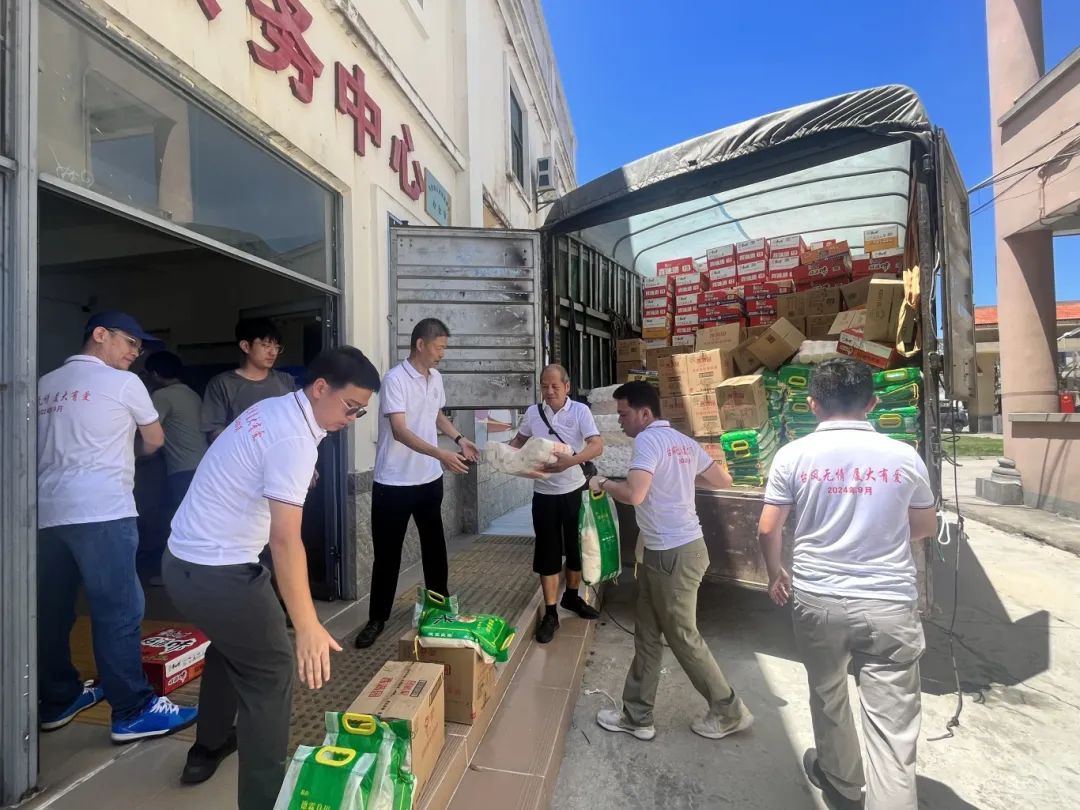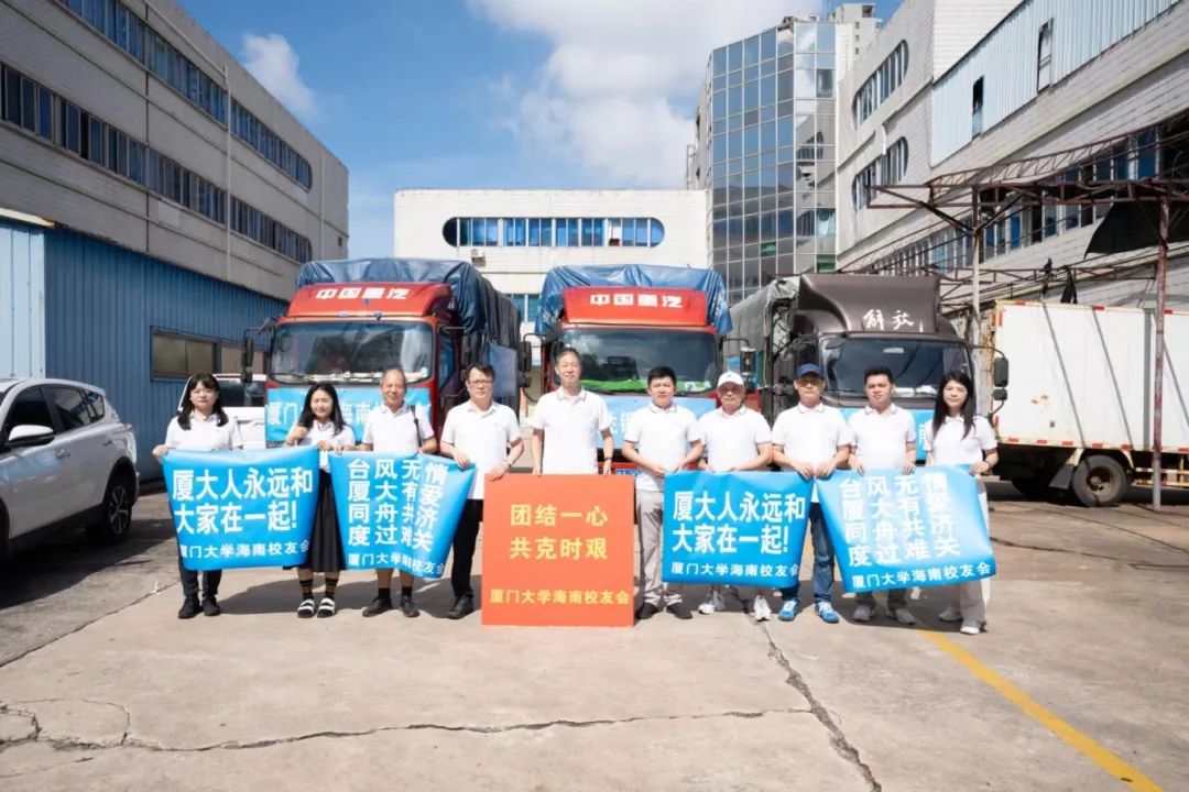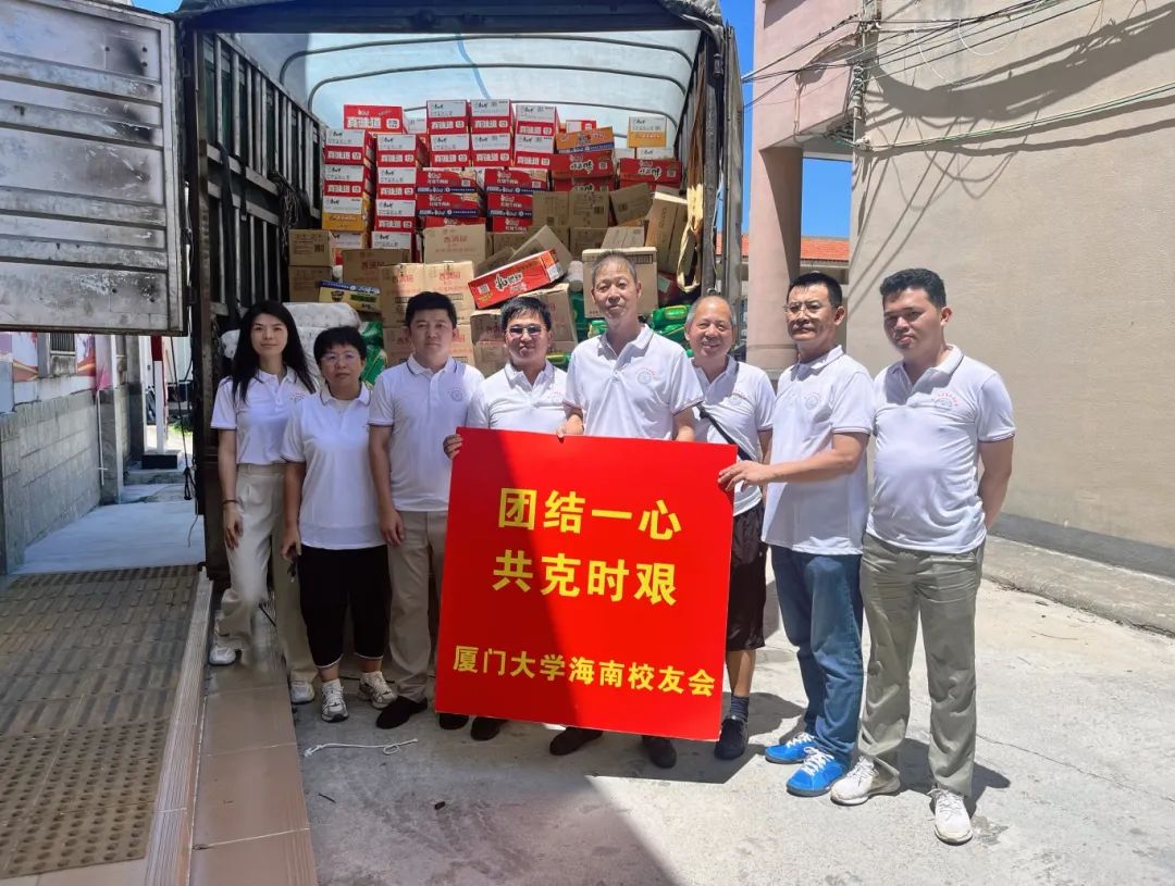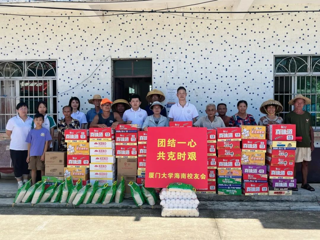 厦门大学海南校友会向文昌市冯坡镇定点捐赠物资,其中包括 100 包大米、100 桶食用油、50 件八宝粥、400 箱桶装面、30 卷三色防雨彩布、100 箱包装方便面、19 箱饼干、300 卷挂面以及 1000 件瓶装水。与此同时,民生银行海口分行向抱罗镇捐赠了 1000 件瓶装饮用水。
