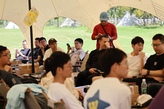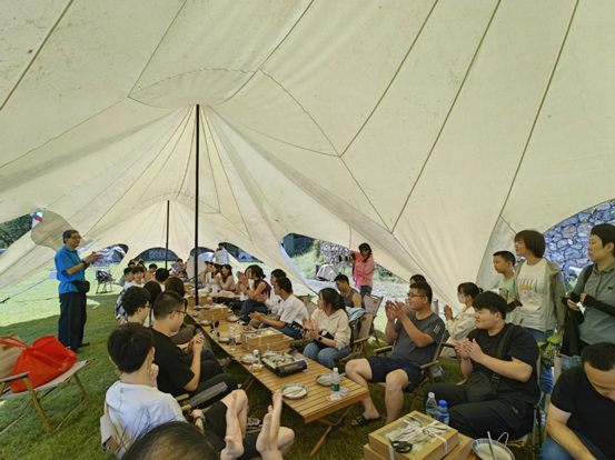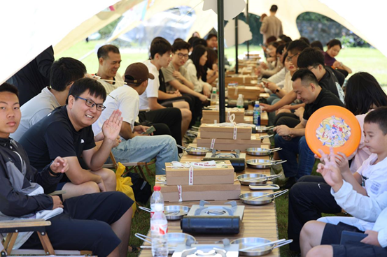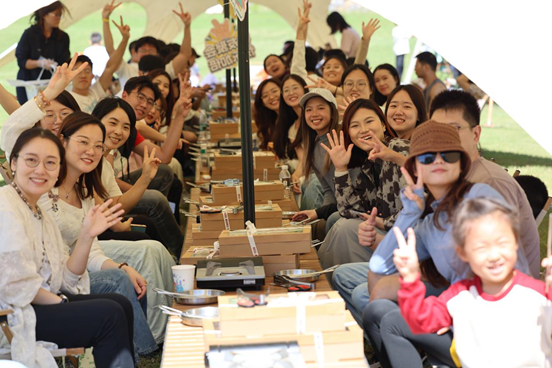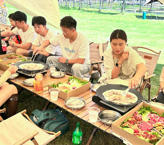 随着太阳逐渐升高,湖畔的空气中弥漫起诱人的烤肉香味。校友围坐在天幕下精心布置的烧烤区,互相配合烹饪着各式各样的美食。烤盘上肉类、蔬菜等食材在火焰的炙烤下发出“滋滋”的声响,香飘四溢,每一口都是对味蕾的极致诱惑。