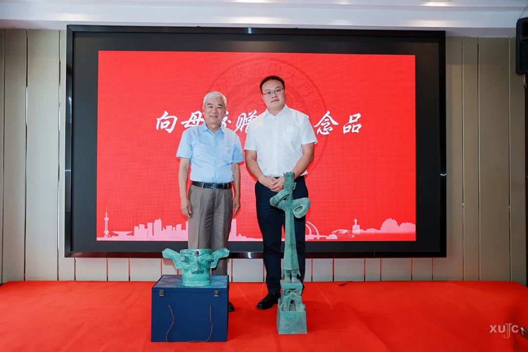 蒋敏龙代表嘉庚学院四川校友会向嘉庚学院赠送了极富四川特色的纪念品——定制三星堆青铜纵目面具和青铜大立人像,祝愿嘉庚学院赓续嘉庚精神,继往开来培养出更多具有国际视野、文化自信和创新精神的人才。
