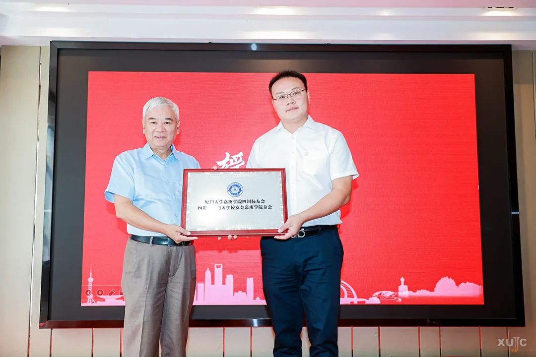 王瑞芳(左)向嘉庚学院四川校友会颁发会牌