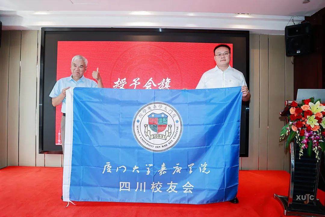 王瑞芳(左)向嘉庚学院四川校友会颁发会旗