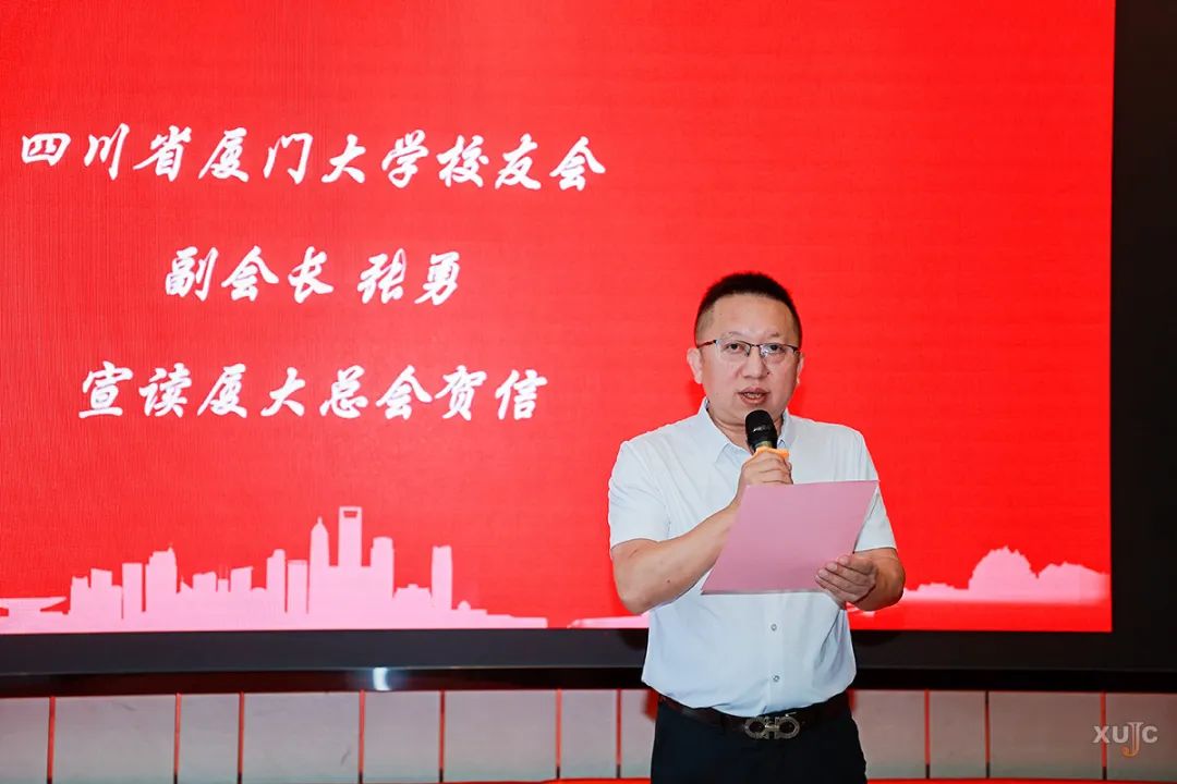 张勇代表厦门大学校友总会宣读贺信。校友总会对嘉庚学院四川校友会的成立表示热烈的祝贺,并希望校友会成立后,继续践行嘉庚精神,弘扬优良校风,为四川省和祖国西部经济社会高质量发展贡献校友们的热情和力量。