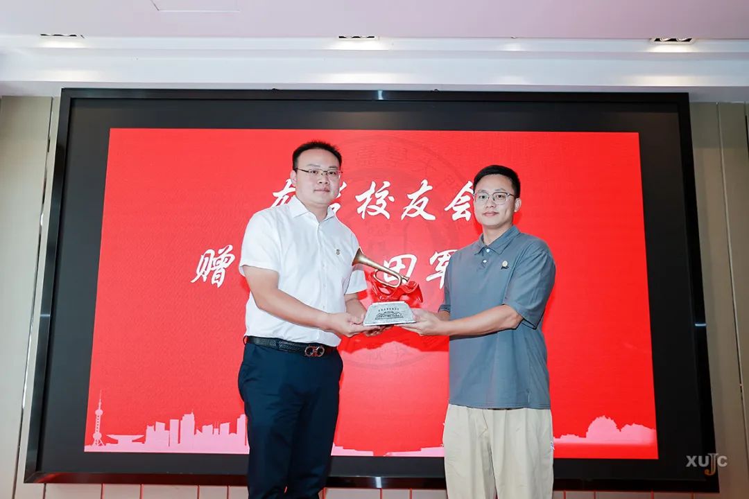 张贺兴(右)代表龙岩校友会送上“红古田军号”雕像