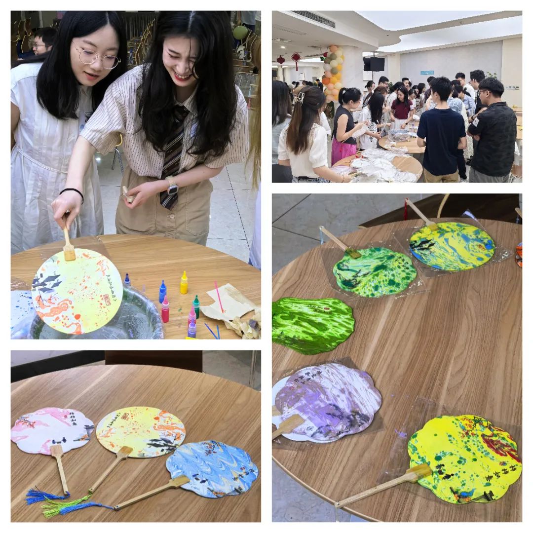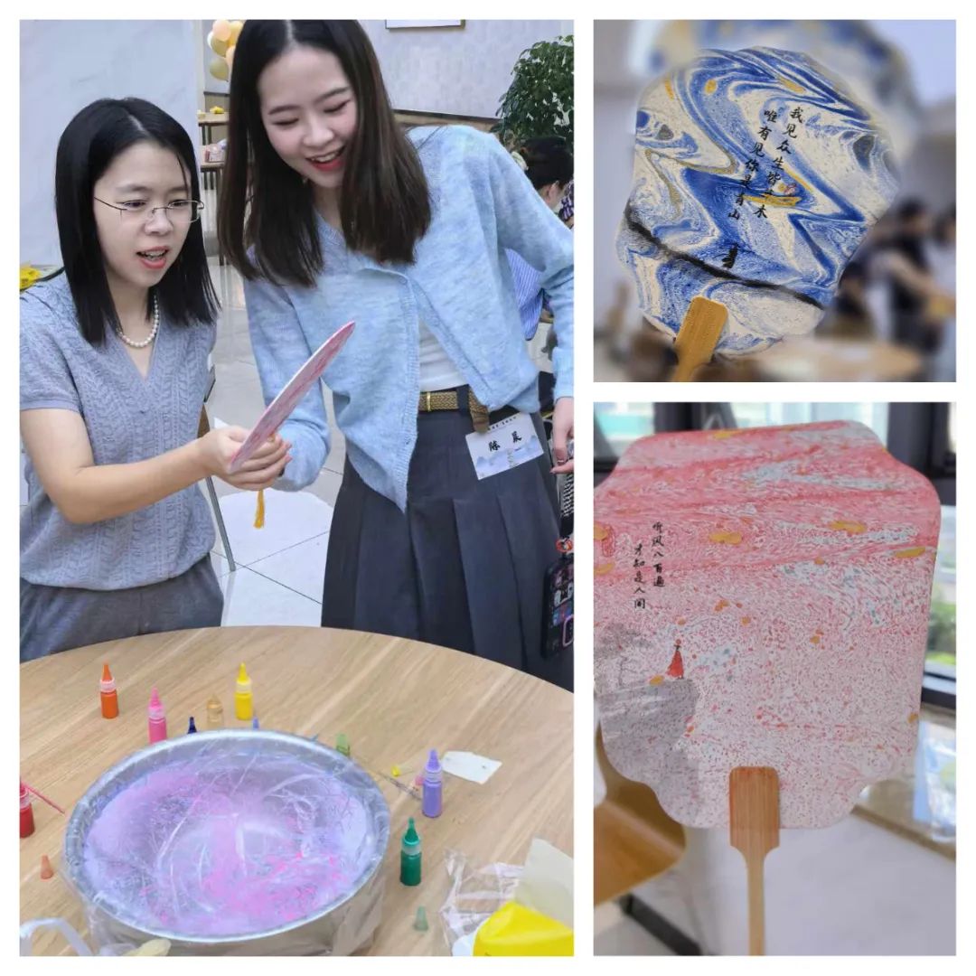 “以漆为媒,以扇为纸,一半人为,一半天成”,漆扇手工制作的过程,让大家感受到了传统手工的艺术之美。调配喜欢的色调,将扇子放入水中,晕染扇面,形成妙趣横生、自然天成的图案,每一把漆扇都是独一无二的艺术品。