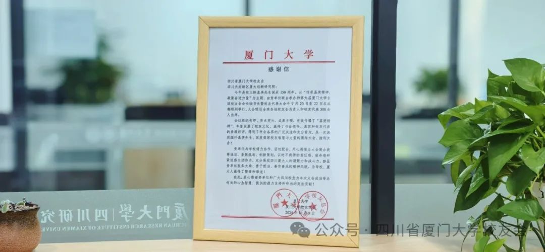 厦门大学和厦门大学校友总会联合发来《感谢信》,称赞此次盛会“是一次深刻缅怀嘉庚先生、深度凝聚校友智慧与力量的团结大会、胜利大会”,充分展现了四川厦大人的凝聚力和战斗力,彰显了服务大局、勇于担当、善作善成的精神风貌,为母校、厦大人赢得了赞誉和荣光!