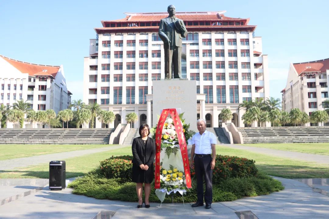 On 21 October 2024, Xiamen University Malaysia (XMUM) held a floral tribute at the statue of Mr. Tan Kah Kee to commemorate the 150th anniversary of the university's founder. President Wang Ruifang and Assistant President Wang Huiqiong presented a flower basket on behalf of university staff and students, paying tribute to Tan Kah Kee and honoring his legacy.