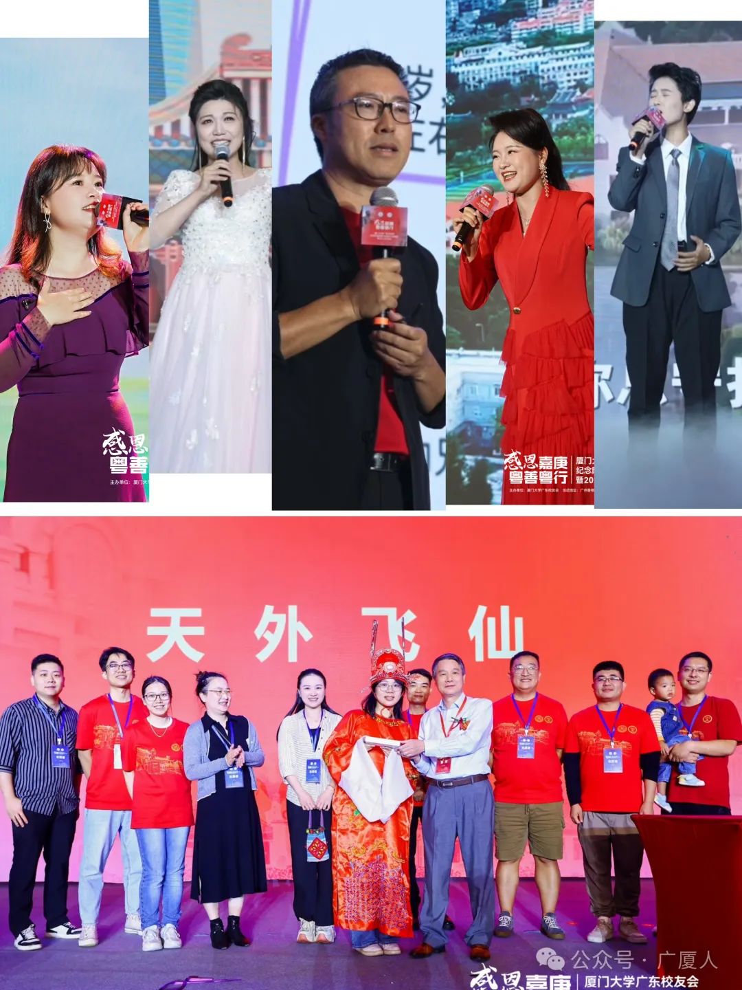 校友们带来了一系列精彩纷呈的节目,场内气氛愈加热烈。一曲书简舞,红扇翻飞,肖健、康淼淼领衔的广东校友会群贤舞蹈队为大家带来大型舞蹈秀《书简舞》,让大家看到了心中若能容丘壑,下笔方能汇山河的书生意气、挥斥方遒;黄鹏校友的一曲《你来了》独唱,将浓情大爱缓缓道来;可爱纯真的厦二代们为大家带来了一场别开生面的《百年厦大,南强风华》走秀;李妍彤校友通过一首《小美满》与校友会大家庭共话嘉庚精神,共度团圆之夜;一场特别的沙画表演,一幅幅《厦大岁月,闪光的日子》,带领大家一同穿越时空,重返校园;游子逸校友的独唱《至善荣光》更是带大家回到母校,再次看到绽放的凤凰花;厦二代朗诵的《怀念陈嘉庚》,让大家循着陈嘉庚先生闪光的足迹,感受他的赤子之心;刘之苹、钟思慧、郭颖欣、陈维维为大家带来的歌曲《春风十万里》,又将大家带入到生机勃勃的祖国大好山河之中;由广东文艺职业学院阿卡贝拉艺术团带来的Acappella人声演唱《我爱你中国》将本次活动氛围推向了高潮。