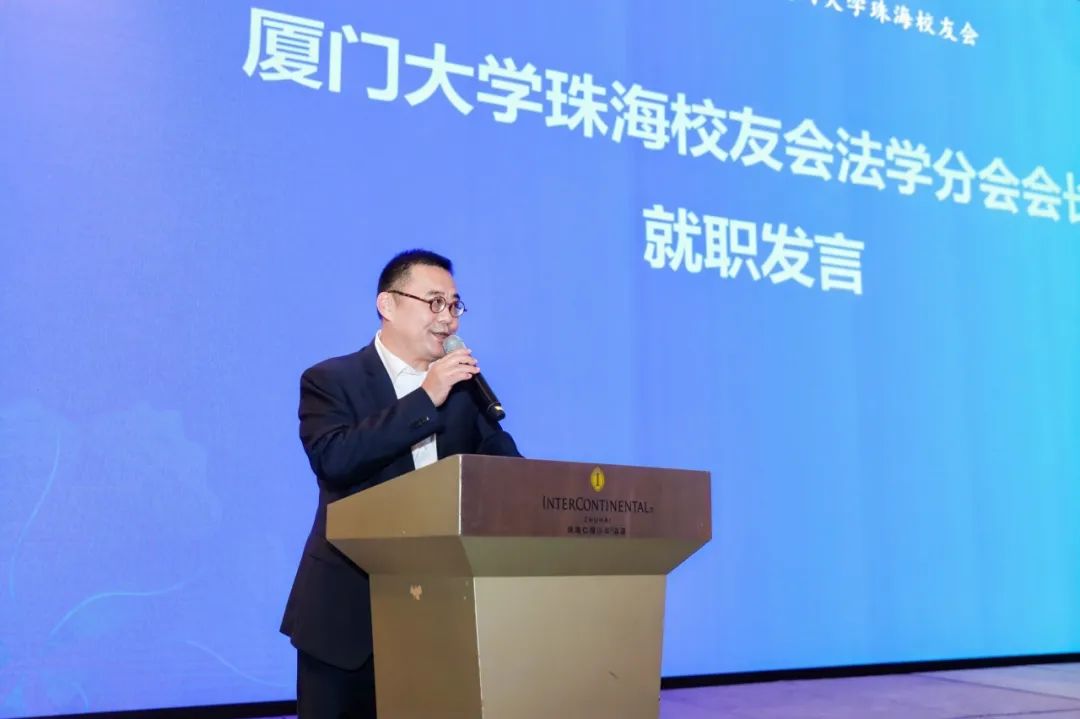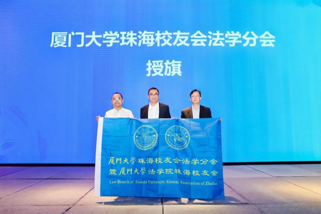 王杏飞详细介绍了法学院的学科建设情况。随后,厦门大学珠海校友会法学分会暨厦门大学法学院珠海校友会在校友总会的指导下,在法学院的帮助下,由珠海法学院校友发起正式成立,并举行授旗仪式,为理事会成员颁发聘书。