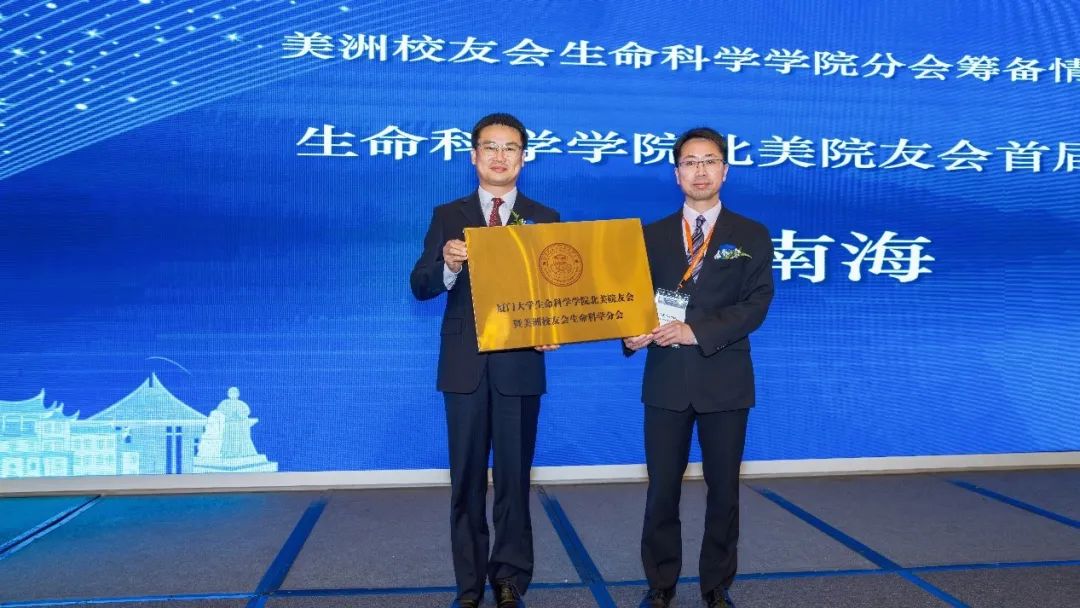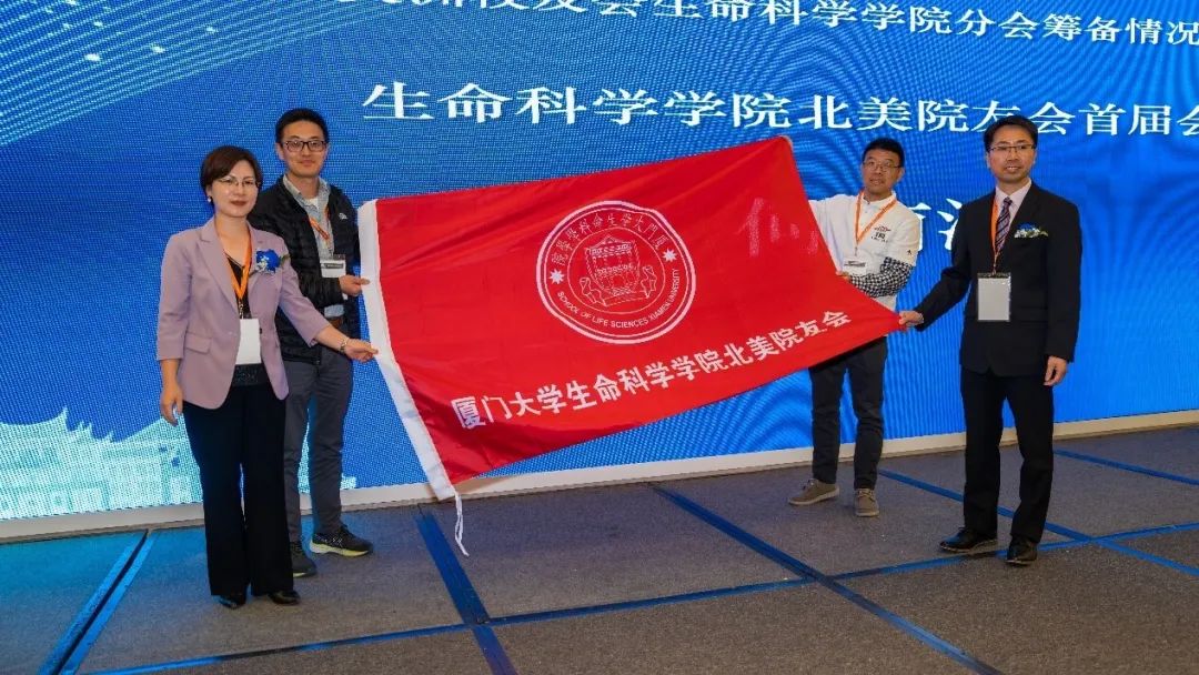 当天晚上,在厦门大学美洲校友会成立40周年庆典暨双年会上,举行了赠送校友会会旗、会牌仪式。