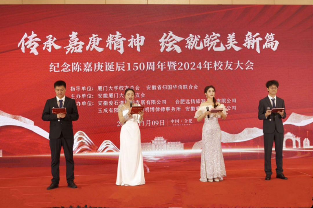 11月9日下午,安徽厦门大学校友会纪念陈嘉庚诞辰150周年暨2024年校友大会在在合肥隆重举行。本次活动以“传承嘉庚精神,绘就皖美新篇”为主题,旨在纪念嘉庚先生的伟大贡献,传承嘉庚精神,同时汇聚校友之力,共谱校友会发展蓝图。来自安徽各地的200余名校友齐聚一堂,共叙同窗情谊。厦门大学党委常委、副校长尤延铖,中国语言文学系教授朱水涌,国内合作办公室副主任吴喜平,校友总会副秘书长郑辉,医学院党委副书记王坤钟,航空航天学院副院长黄玥等母校领导、老师莅临现场。安徽省归国华侨联合会党组成员、专职副主席兼秘书长刘君一行到场祝贺。来自上海、浙江、广东、湖南、武汉、江西等地的厦大兄弟校友会代表以及在皖高校联盟的清华大学、武汉大学、南京大学等校友会代表与会交流。大会还邀请了合肥一中等7所优质生源基地中学领导出席。