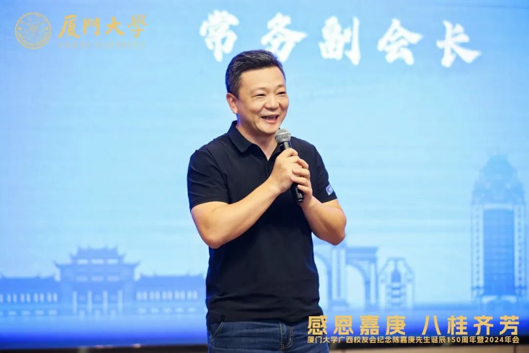 赖虹凯代表母校和校友总会讲话。他讲述厦门大学与广西的校地情缘,对广西校友会的工作开展予以充分肯定;鼓励广大校友积极发挥广西作为东盟地区经济的地缘优势作用,为广西经济和社会发展贡献力量;希望校友加强与母校互动,促进校企合作。他对广大校友持续不断关心与大力支持母校表示衷心感谢,并祝福广西校友会各项工作“芝麻开花节节高”。